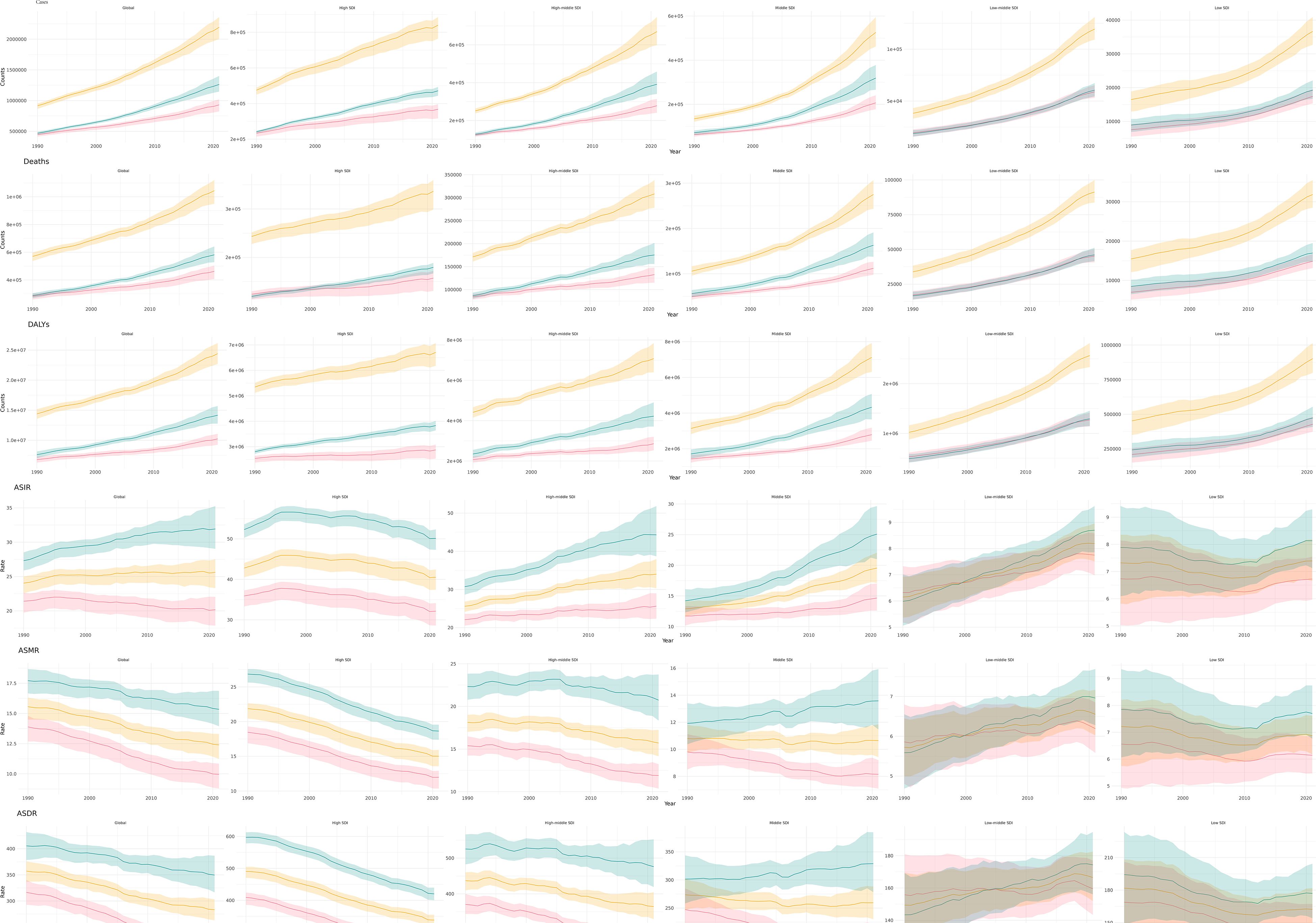 In all regions, the number of cases, deaths, and DALYs associated with CRC have increased annually from 1990 to 2021 (Figure 4). Although ASMR and ASDR are generally declining, both low and medium SDI regions are experiencing an increase in the burden of CRC. This trend indicates that SDI factors significantly influence the burden of CRC.