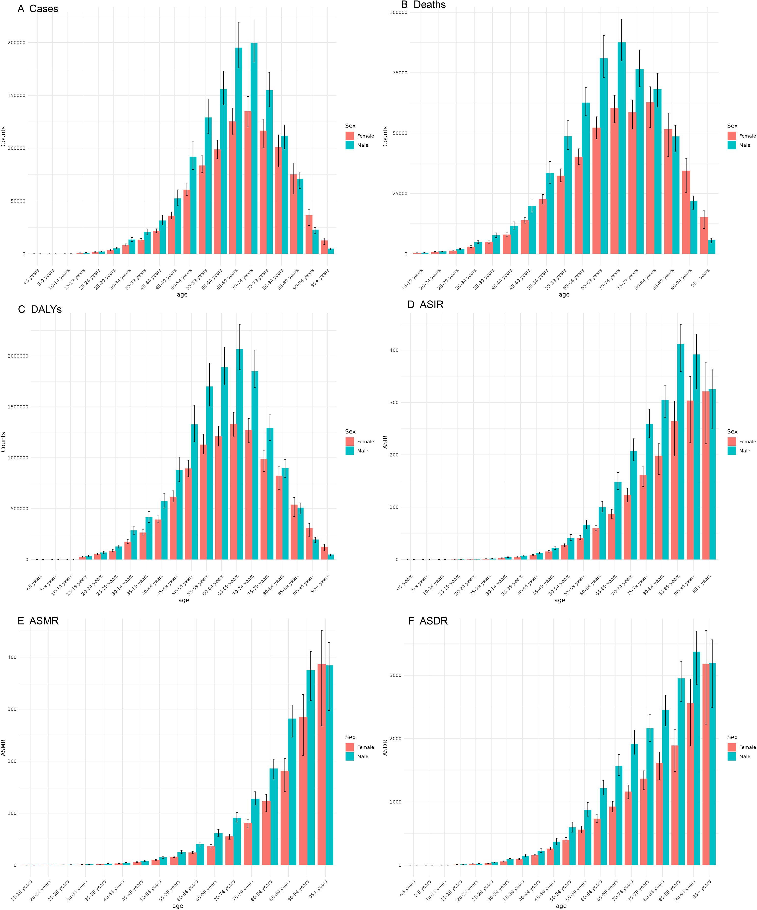 Figure 5. Burden of colorectal cancer among males and females across different age groups in 2021. (A) Number of incident cases; (B) Number of deaths; (C) DALYs; (D) ASIR; (E) ASMR; (F) ASDR.