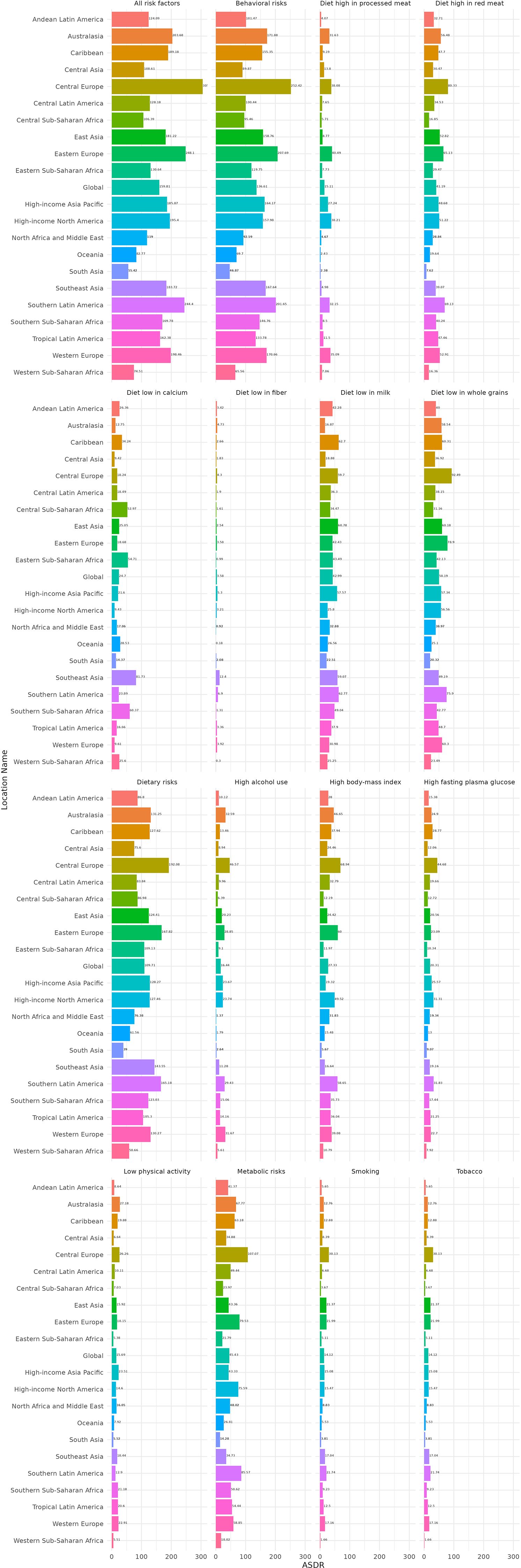 The GBD 2021 study identifies 88 risk factors, specifically focusing on the DALYs attributable to CRC. The risk factors we analyzed include behavioral risks, metabolic risks, low physical activity, smoking, tobacco, dietary risks, high alcohol use, high body mass index, high fasting plasma glucose, diets low in calcium, diets low in fiber, diets low in milk, diets low in whole grains, diets high in processed meat, and diets high in red meat. These factors contribute to the DALYs associated with CRC, and our analysis measured the individual impacts of these factors within the GBD 2021 framework (20). Based on GBD 2021 on risk factors for CRC, this study investigates the effect of different risk factors on ASDR for CRC in 21 GBD regions. The attributable deaths and DALYs for each risk factor were calculated by applying the pre-computed Population Attributable Fractions (PAFs)—which were obtained directly from the GBD 2021 dataset—to the total CRC death and DALY estimates, respectively. These GBD PAFs already incorporate comprehensive uncertainty propagation from all input parameters.