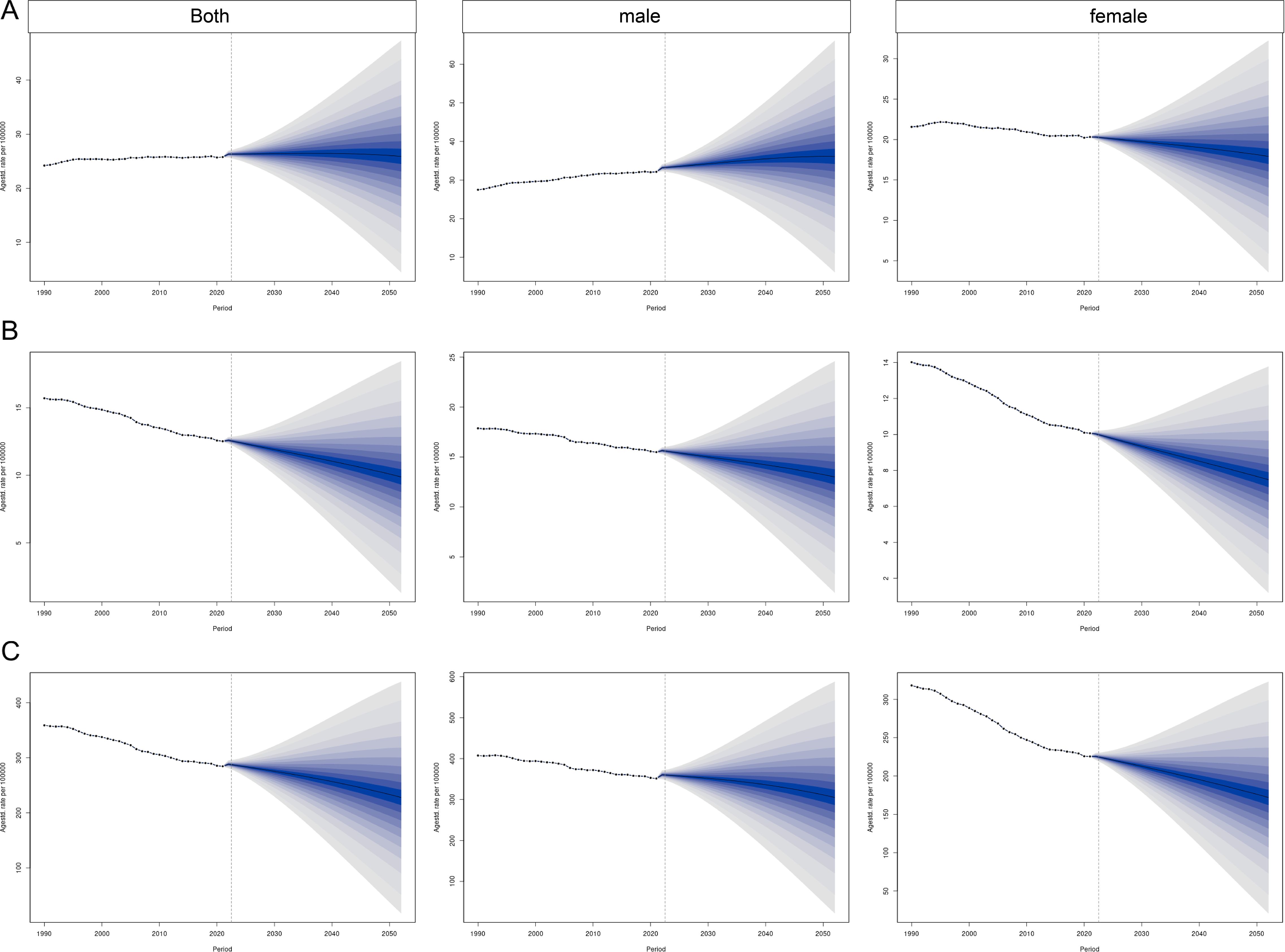 The predictive performance of the BAPC model was evaluated through a back-testing procedure, in which the model was trained on data from 1990–2010 and used to predict the period 2011–2021. The model demonstrated good calibration and robust uncertainty quantification. Quantitative metrics, including MAE, RMSE, CRPS, and 95% UI coverage for each sex group, are provided in Supplementary Table S1, while calibration plots comparing observed and predicted values are shown in Supplementary Figure S1. Full details of the back-testing procedure are described in Supplementary Method 1.