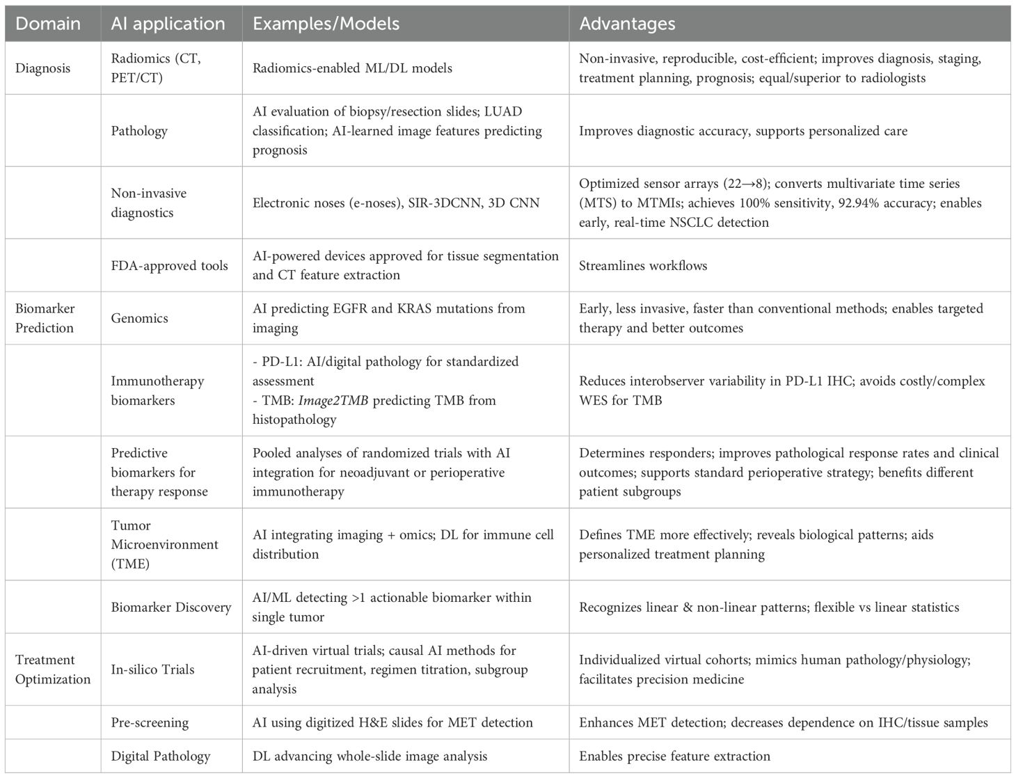 Artificial intelligence (AI), more specifically through machine learning (ML) and natural language processing (NLP), is transforming the care of NSCLC by greatly improving the accuracy of histological subtype classification, molecular profiling, and treatment personalization (44). Integration of AI into radiomics, genomics, and pathology interpretation is transforming traditional workflows to provide more precise, efficient, and personalized care. Radiomics transforms imaging information—e.g., CT or PET/CT scans—into high-dimensional, quantifiable features with automated algorithms. Such models can non-invasively extract subtle intra- and peri-tumoral features, providing reproducible and cost-efficient insights into lung cancer and its tumor microenvironment (45). Radiomics-enabled ML or DL models are currently well established in every phase of lung cancer management—diagnosis, staging, treatment planning, and prognosis—with performance equal to or even superior to that of radiologists (46). In the field of genomics, AI facilitates early prediction of driver mutations like EGFR and KRAS. EGFR mutations are associated with improved response to erlotinib and gefitinib, while KRAS mutations indicate therapeutic resistance. Early detection of these mutations using AI-based, image-guided prediction allows targeted therapy and enhanced outcomes. While conventional methods are effective, they tend to be invasive and time-consuming. In contrast, AI-based image-guided mutation prediction offers a promising, less invasive alternative (20). In pathology, AI aids in the evaluation of biopsy and resection slides to subtypes such as LUAD that require unique treatment strategies. According to studies, image features learned through AI can be used to predict prognosis and support personalized care (47). AI is also applied to non-invasive diagnostics, such as electronic noses (e-noses) that detect NSCLC from volatile organic compounds in breath, with advanced models like SIR-3DCNN optimizing sensor arrays and using 3D convolutional networks, achieving 100% sensitivity and 92.94% accuracy, demonstrating potential for early, real-time lung cancer detection (48). Therefore, AI greatly improves diagnostic accuracy, clinical workflows, and precision oncology in NSCLC.