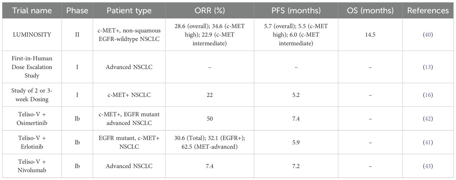 100. Camidge DR, Bar J, Horinouchi H, Goldman JW, Moiseenko FV, Filippova E, et al. Telisotuzumab vedotin monotherapy in patients with previously treated c-Met–overexpressing non-squamous EGFR wildtype advanced NSCLC: Primary analysis of the LUMINOSITY trial. J Clin Oncol. (2024) 42:103–3. Available online at: https://ascopubs.org/doi/pdf/10.1200/JCO.2024.42.16_suppl.103 (Accessed July 23, 2025).