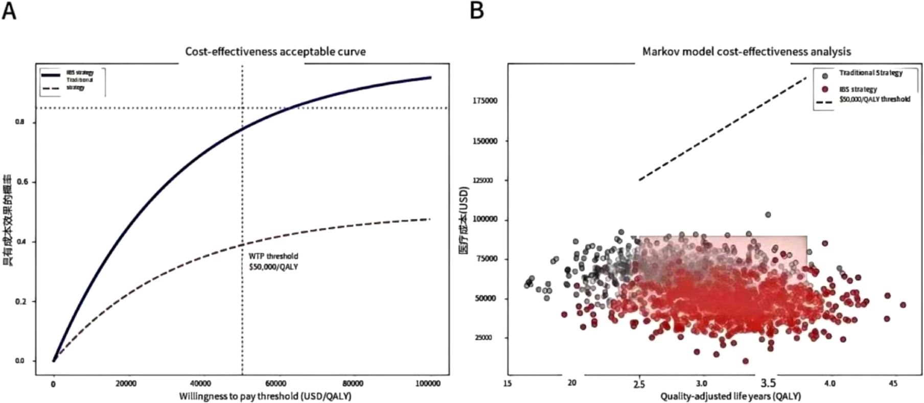 Figure 1. Health economics assessment. The cost-effectiveness analysis indicates that when the willingness to pay is ≥ $4,500/QALY, the IBS strategy has an 85% probability of outperforming the traditional approach, and Markov model simulations reveal savings of $ 3590/QALY. (A) Cost-effectiveness acceptability curve. When the willingness to pay is ≥ $4,500/QALY, the acceptable probability of the IBS strategy is > 85% (the grey dotted line represents the traditional strategy). (B) Markov model cost-effectiveness scatter plot. The red area indicates the dominant quadrant of the IBS strategy (lower cost and better effect), and the black dotted line represents the willingness-to-pay threshold of $3,590 per QALY.