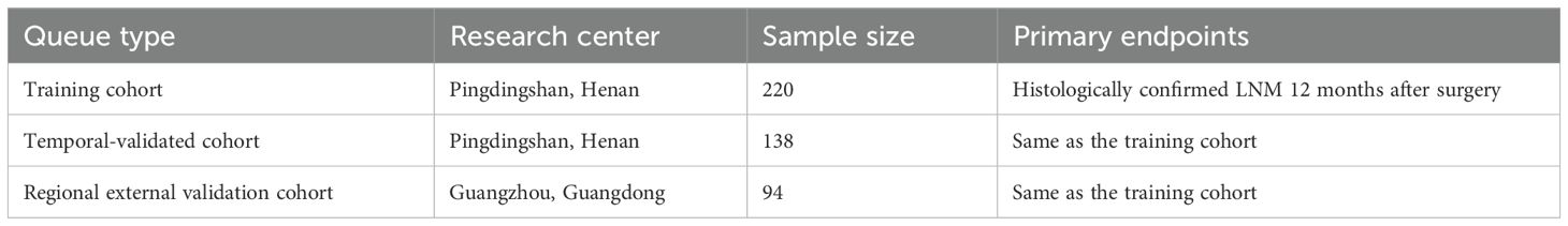 We implemented a prospective three-cohort validation framework (training, temporal validation, and regional validation) compliant with TRIPOD-AI type 2b guidelines to ensure methodological rigor (26). Consecutive patients with histologically confirmed ESCC undergoing R0 resection [IC-SNE 2024 criteria (27)] between March 2022 and June 2024 were enrolled from the General Hospital of China Pingmei Shenma Medical Group and two collaborating tertiary centers. The training cohort comprised 220 patients (March 2022–December 2023), followed by temporal validation (n = 138; January–April 2024) and regional external validation (n = 94; May–June 2024). Inclusion required treatment-naïve status and preoperative serum collection within 72 h; exclusions encompassed distant metastasis (M1), autoimmune diseases, or concurrent malignancies. All participants provided written informed consent under Institutional Review Board approval, with demographic and clinicopathological characteristics detailed in Table 1.