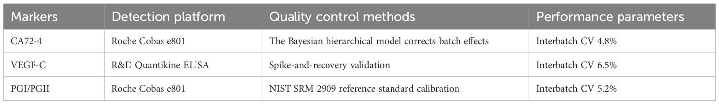 Fasting serum samples were analyzed using standardized assays: CA72–4 via electrochemiluminescence (Roche Cobas e801; limit of detection [LOD], 0.8 U/mL), VEGF-C by enzyme-linked immunosorbent assay (R&D Systems DY257; interassay CV < 8%), and pepsinogen I/II ratio (PGI/PGII) through latex-enhanced immunoassay (Roche Cobas e801). Detailed information on the detection platform, quality control methods, and key performance parameters for each biomarker is summarized in Table 2. Rigorous quality control adhered to EURECCA-Esophageal international standards, consistent with the protocols outlined in Table 2—including Bayesian hierarchical modeling for CA72-4 batch-effect correction, spike-and-recovery validation for VEGF-C, and NIST SRM 2909 calibration for PGI/PGII. Replicate analysis demonstrated high reproducibility (intra-class correlation coefficient >0.92), further supporting the reliability of the biomarker data presented in Table 2.