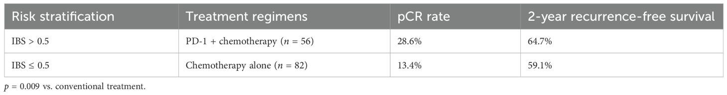 Results: The IBS model demonstrated superior discriminative ability in the training cohort (n = 220; area under the receiver operating characteristic curve (AUC) = 0.936; 95% confidence interval (CI): 0.908–0.964) compared to the AJCC ninth edition staging system (ΔAUC = 0.154; p < 0.001). Performance was maintained in validation cohorts. High-risk patients (IBS > 0.5) receiving PD-1 inhibitor plus chemotherapy achieved a pathological complete response (pCR) rate of 28.6%, representing a 115% increase over conventional therapy (p = 0.009).