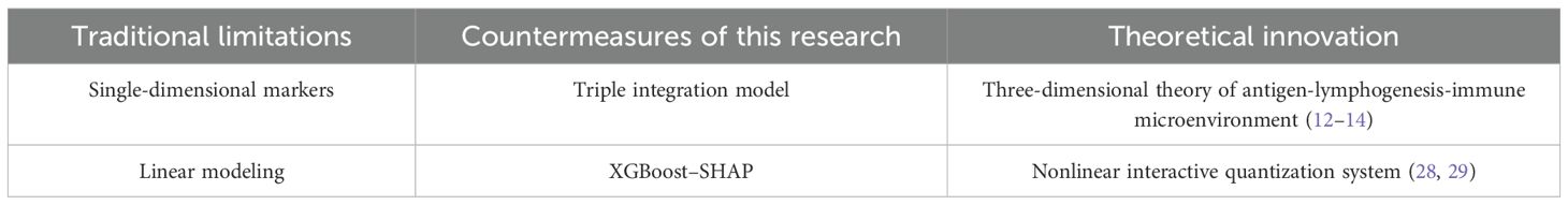 Clinically, IBS enables precision intervention: high-risk patients (IBS > 0.5) receiving PD-1 inhibitors + chemotherapy achieved 28.6% pCR (115% increase; p = 0.009), with the dynamic model (IBSdynamic) detecting metastasis 6–8 weeks earlier than conventional imaging (ΔAUC=0.062). Conversely, low-risk patients (IBS ≤ 0.2) safely extended PET-CT intervals to 6 months (2-year RFS = 92.3%), reducing imaging burden by 38%. Key innovations overcoming traditional limitations are summarized in Table 5.