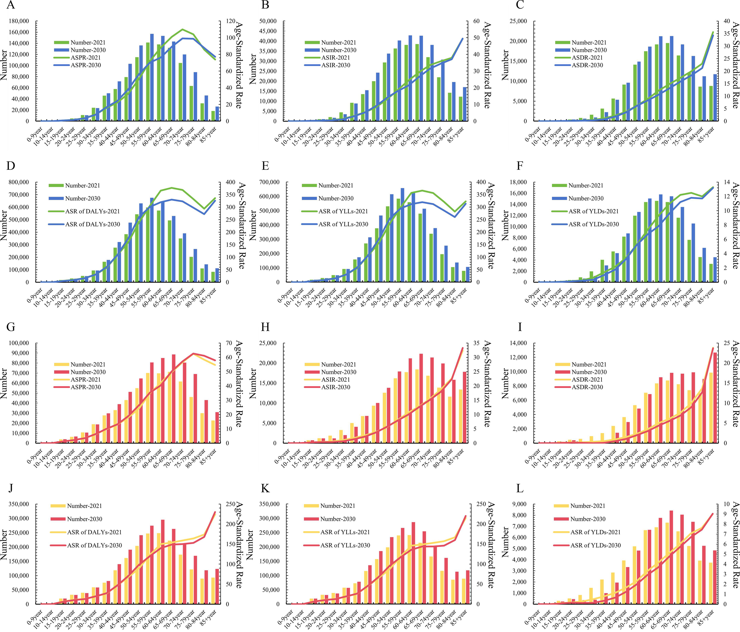From 1990 to 2021, the global ASR of Incidence (ASIR), ASR of Prevalence (ASPR), and ASR of YLDs for LOCC had significantly increased, while the ASR of Death (ASDR), DALYs, and YLLs had decreased. The BAPC model predicted that by 2030, the ASIR and ASPR for males would decrease, while for females, an upward trend would be observed. The middle-aged and elderly population (>50 years) would still be the main patient group (accounting for over 60%).