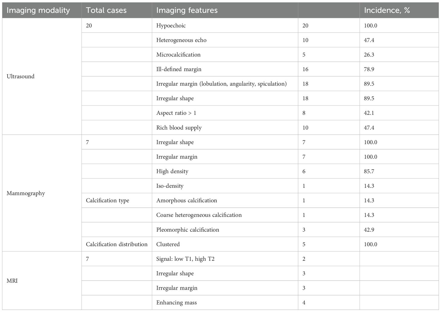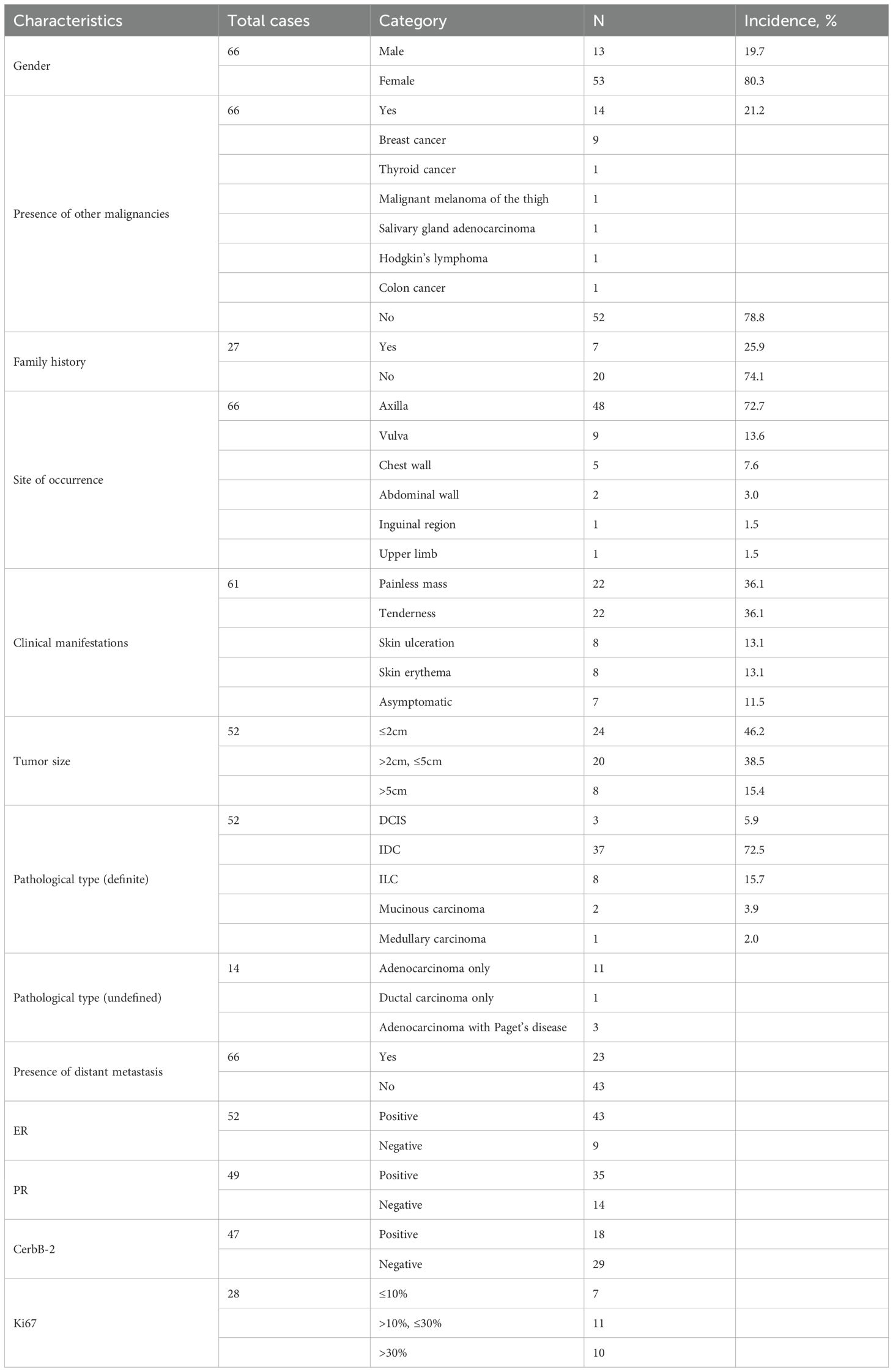 A total of 46 articles related to EBC from January 2005 to April 2025 in the PubMed database were retrieved and summarized together with this case. The general clinical and pathological data of the patient are shown in Table 1. The imaging manifestations of the patient are shown in Table 2. The collected data includes the patient’s gender, age, personal history, family history, location of occurrence, clinical manifestations, pathological type, metastasis, prognosis, and imaging findings. A total of 65 cases from 64 patients were collected (one case was bilateral axillary EBC). Because the integrity of clinical data obtained in each case was different, not every patient was included in the analysis of each variable.
