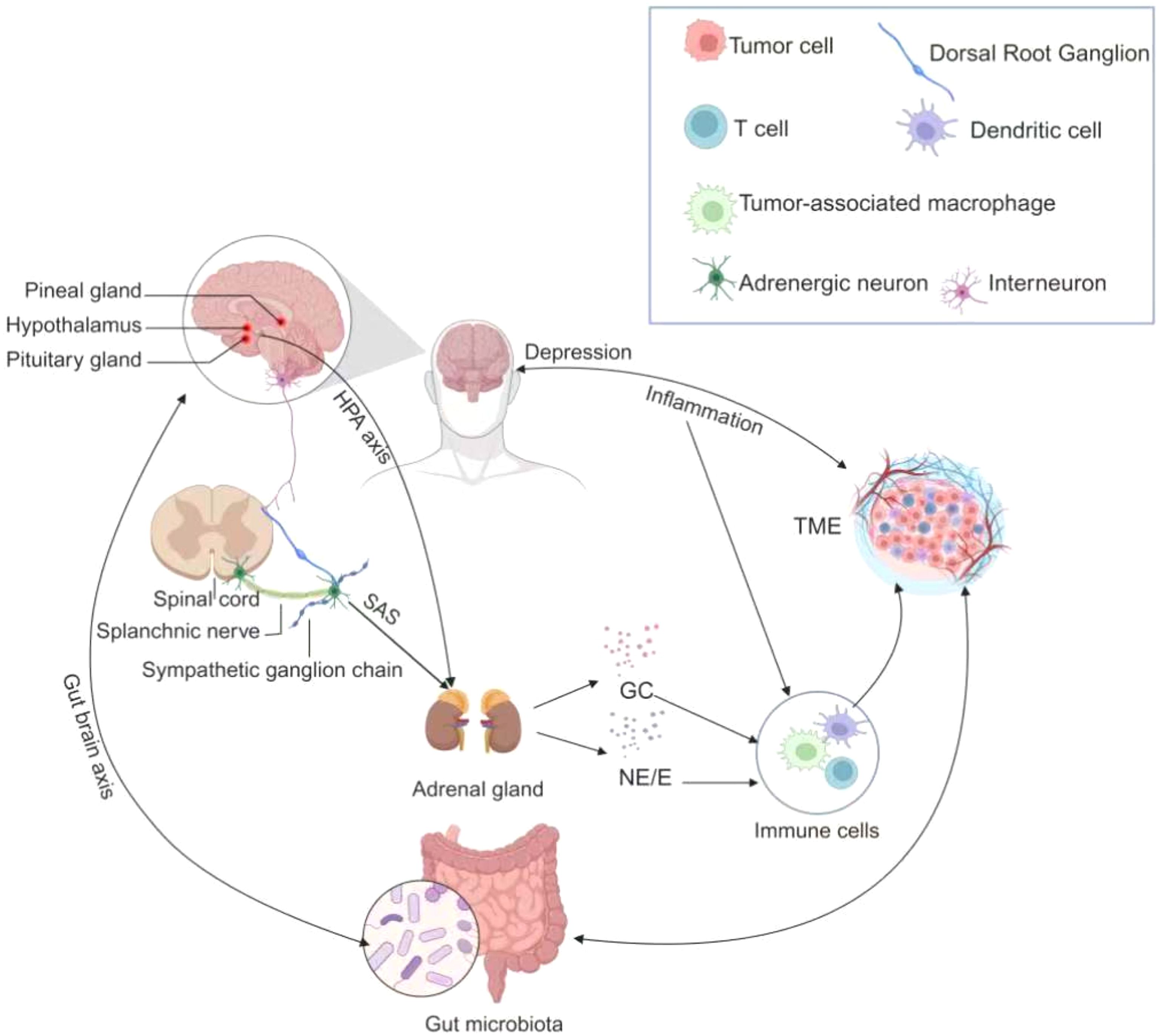 Figure 2. The pathophysiological mechanisms in multimorbidity of cancer and depression. The figure illustrates the intricate pathophysiologic relationships in individuals with co-morbid cancer and depression. Tumor cells release inflammatory cytokines that traverse the blood-brain barrier, thereby precipitating depressive symptoms. Subsequently, depression stimulates the Hypothalamic-pituitary-adrenal axis (HPA axis) and the Sympathetic-adrenal-medullary system (SNS), prompting the adrenal glands to secrete glucocorticoids and catecholamines. These stress hormones can influence tumor progression by interacting with various cell types in the tumor microenvironment. Furthermore, a bidirectional relationship exists between the gut microbiome and both cancer and depression. These multifaceted mechanisms collectively establish a pathophysiologic link between the co-morbidities of cancer and depression.