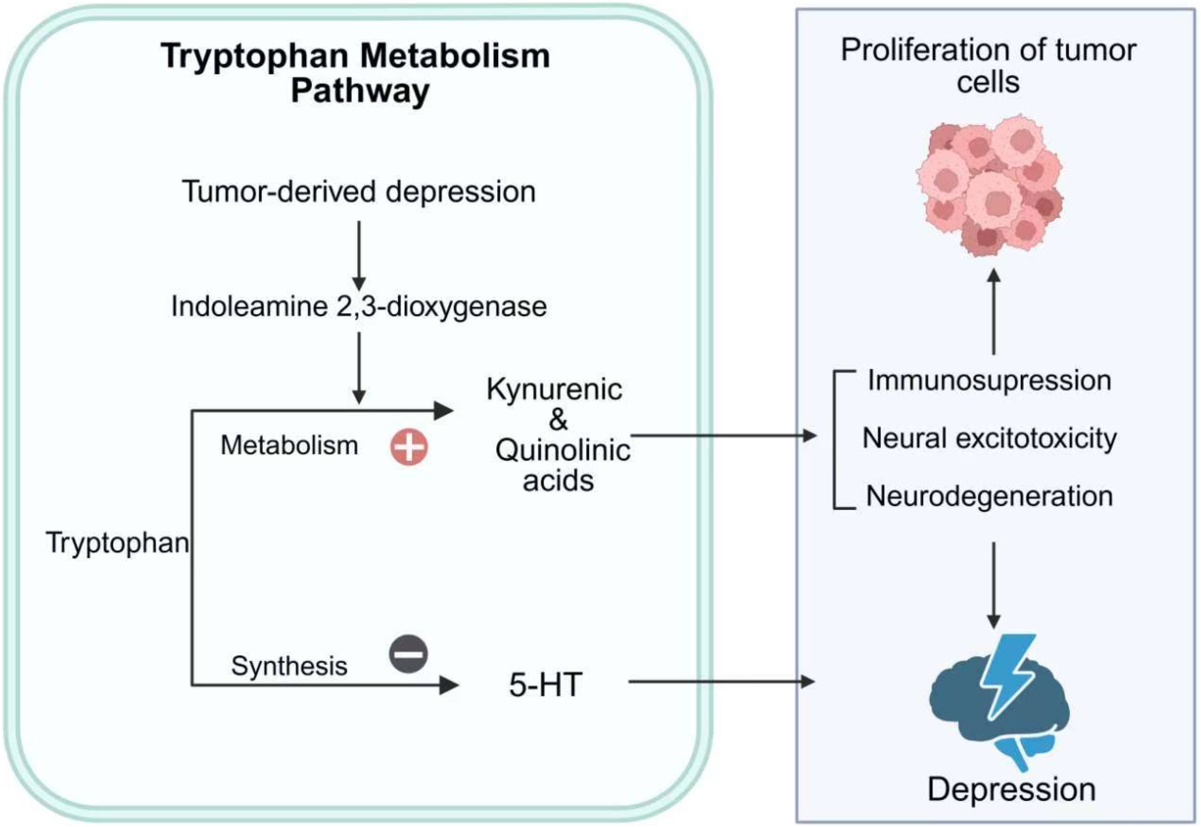 Figure 3. Tryptophan metabolism in cancer-depression multimorbidity. This figure illustrates the role of tryptophan metabolism in the multimorbidity of cancer and depression. Tumor-derived depression activates IDO, shifting tryptophan metabolism toward the production of kynurenic and quinolinic acids. This metabolic shift reduces the synthesis of 5-HT, contributing to depressive symptoms. Additionally, the accumulation of kynurenic and quinolinic acids promotes immunosuppression, neural excitotoxicity, and neurodegeneration, which can exacerbate both tumor cell proliferation and depression. The figure highlights the bidirectional interaction between cancer and depression through tryptophan metabolic pathways.