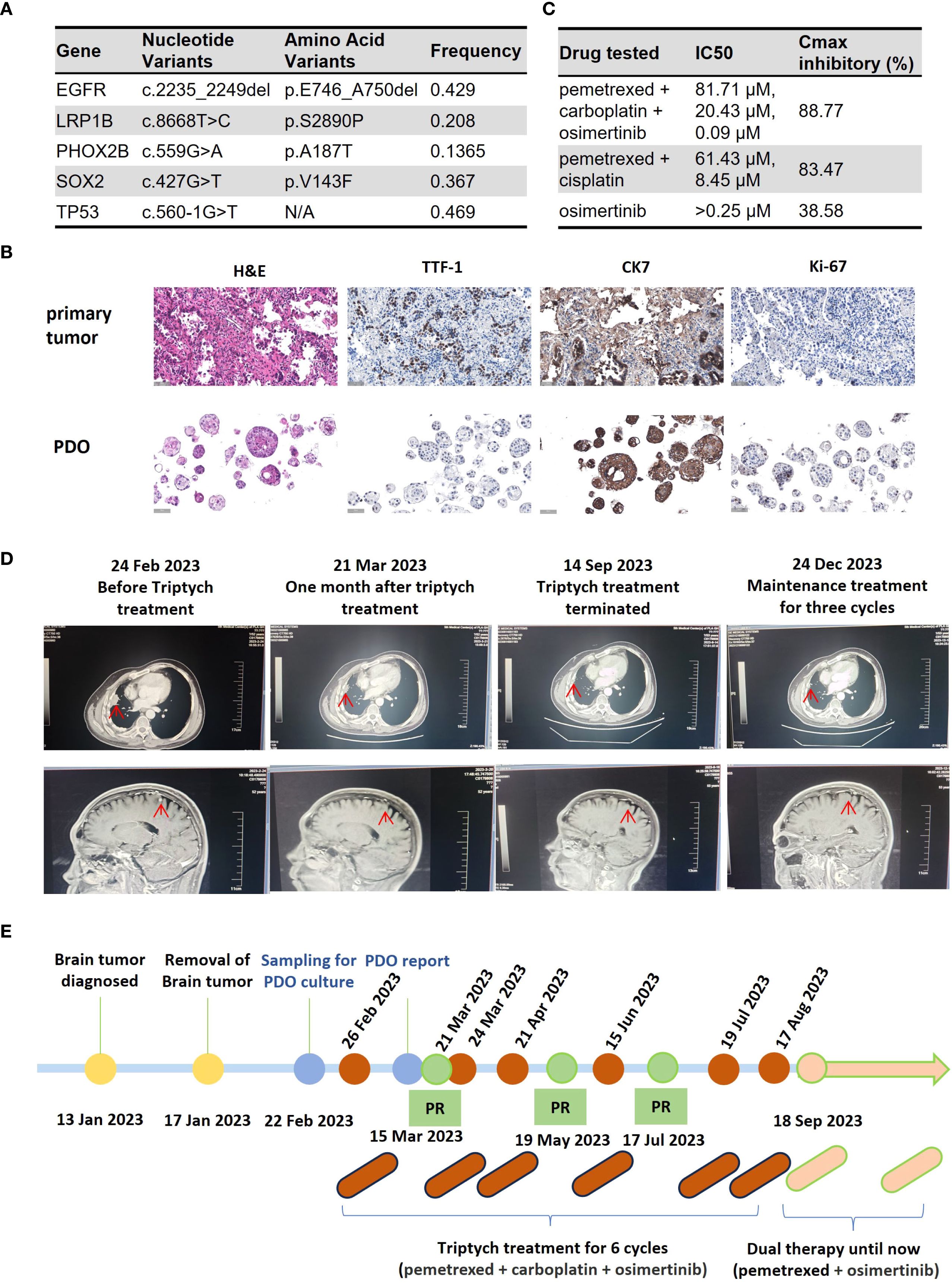 Figure 1. Clinical course of Case 1, a patient with EGFR-mutant NSCLC with brain metastases. (A) Table of somatic mutations detected in the tumor tissue sample. (B) Histological comparison confirming the fidelity of the patient-derived organoid (PDO) to the primary tumor via H&E and IHC staining for key biomarkers. (C) Results of the PDO drug sensitivity assay. Cell viability was measured using an ATP-based assay following drug exposure. The table displays the half-maximal inhibitory concentration (IC50) and the maximal inhibitory rate for each agent. (Data are presented as the mean of technical replicates; error bars and statistical tests were not reported). (D) Serial imaging confirming a partial response (PR) to treatment. (E) Timeline of the patient’s clinical course, from diagnosis through treatment and follow-up. (H&E, hematoxylin and eosin; IHC, immunohistochemistry; TTF-1, thyroid transcription factor-1; CK7, cytokeratin 7; PDO, patient-derived organoid; IC50, half-maximal inhibitory concentration).