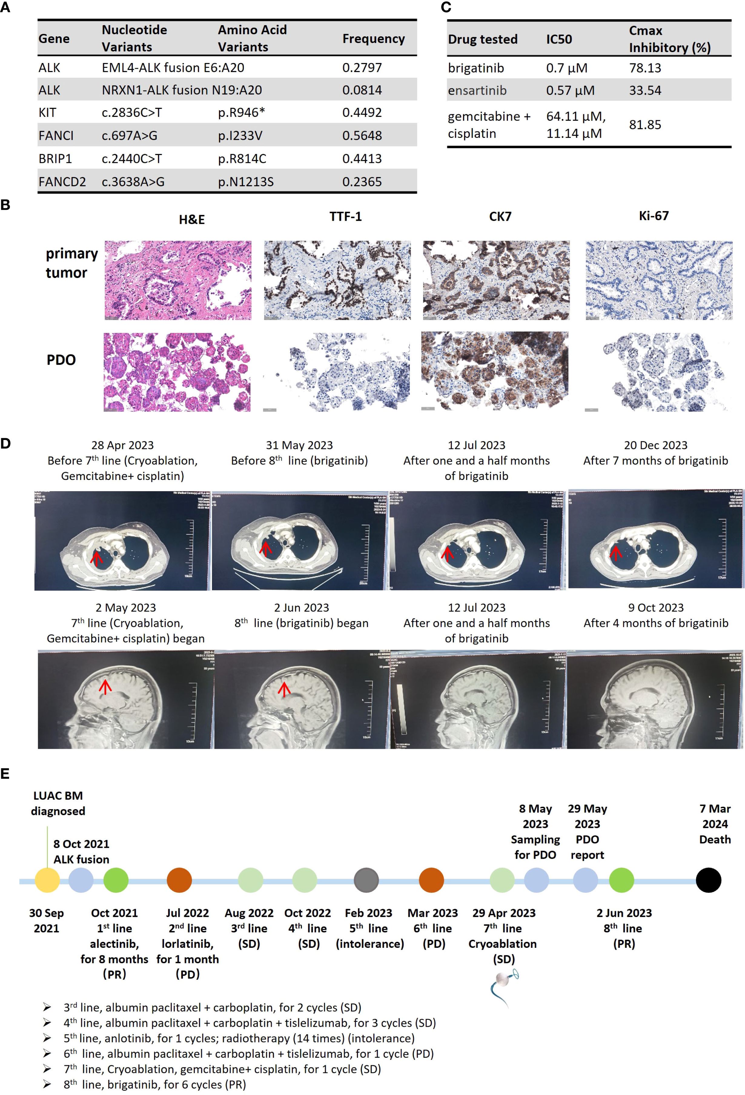 Figure 2. Clinical course of Case 2, a patient with dual ALK-fusion NSCLC. (A) Table of somatic mutations and fusions detected in the metastatic tumor tissue. (B) Histological comparison confirming the fidelity of the PDO to the metastatic pleural tumor. (C) Results of the PDO drug sensitivity assay. The table displays the IC50 and maximal inhibitory rate for each tested agent. (IC50 values represent the mean of technical replicates; standard deviations are not reported). (D) Serial imaging showing a PR after initiation of 8th-line therapy with brigatinib. (E) Timeline of the patient’s extensive clinical course, culminating in a PDO-guided therapy selection. (H&E, hematoxylin and eosin; IHC, immunohistochemistry; TTF-1, thyroid transcription factor-1; CK7, cytokeratin 7; PDO, patient-derived organoid; IC50, half-maximal inhibitory concentration).