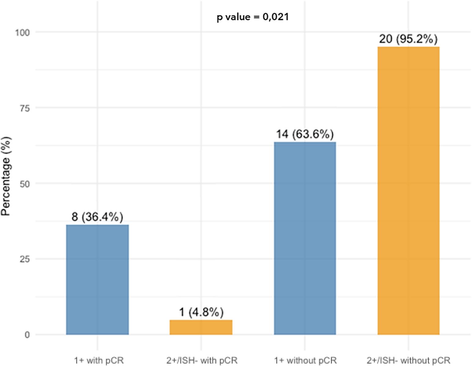 Figure 1. Bar chart showing the distribution of pCR rates based on HER2-low status. Among IHC 1+ patients, 36.4% (8 out of 22) achieved pCR. In contrast, among IHC 2+/ISH- patients, only 4.8% (1 out of 21) achieved pCR. This illustrates a statistically significant difference in pCR rates between the two subgroups (p =0.021). IHC, Immunohistochemistry; ISH, In situ hybridization; pCR, Pathologic complete response.
