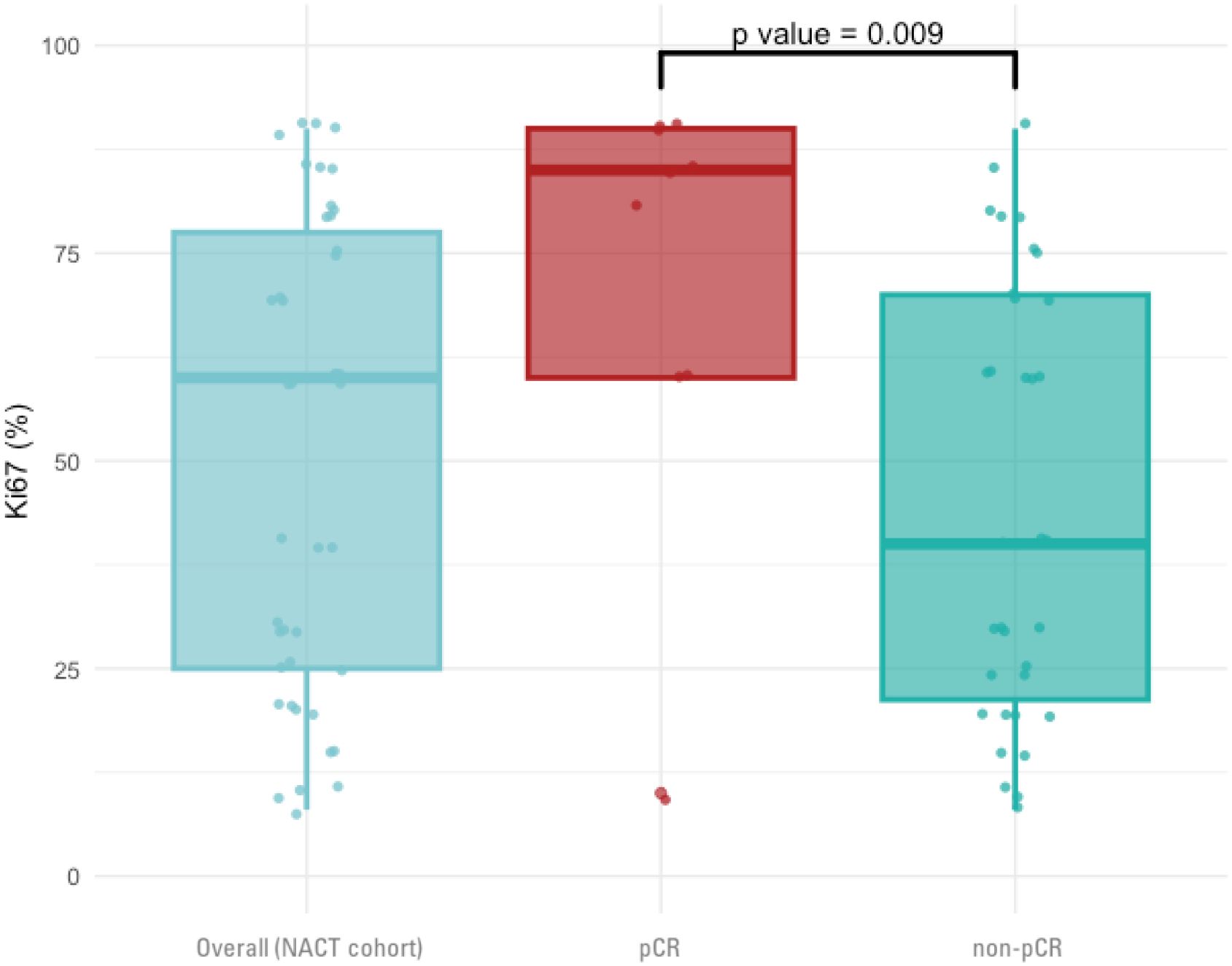 Figure 2. Box plots illustrating the distribution and median Ki-67 levels measured in the diagnostic biopsy in three groups: the overall cohort of patients treated with NACT, those who achieved a pCR, and those who did not achieve pCR (non-pCR). A statistically significant difference in Ki-67 levels between the pCR and non-pCR groups is noted NACT, Neoadjuvant chemotherapy; pCR, Pathologic complete response.