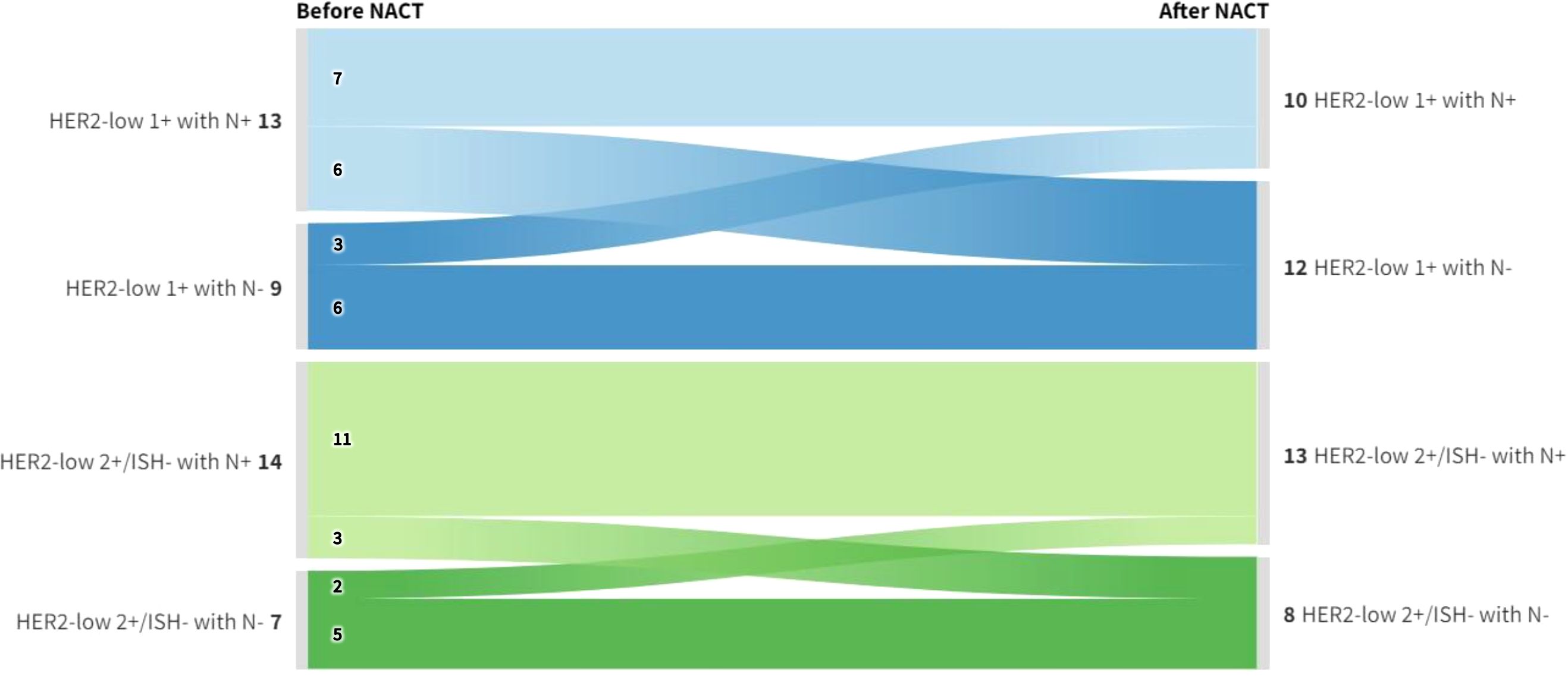 Figure 3. Sankey diagram depicting the variation in nodal status before and after NACT across HER2-low subgroups. The diagram illustrates the distribution of nodal status (positive [N+] and negative [N-]) in both IHC 1+ and IHC 2+/ISH- patients before and after NACT. Despite the observed shifts, no statistically significant differences were found between the HER2-low subgroups concerning changes in nodal status following NACT (p = 0.384). IHC, Immunohistochemistry; ISH, In situ hybridization; NACT, Neoadjuvant chemotherapy.