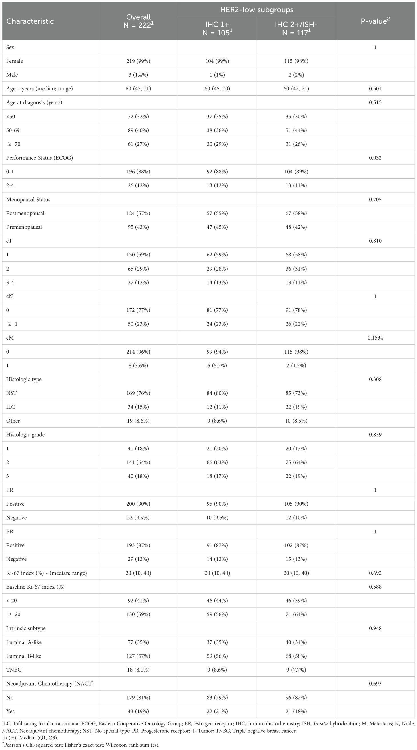 From January 2018 to December 2020, a total of 222 consecutive patients diagnosed with HER2-low BC were screened, all of whom met eligibility criteria: 105 (47%) were classified with IHC1+ and 117 (53%) with IHC2+/ISH-. No patients were excluded.