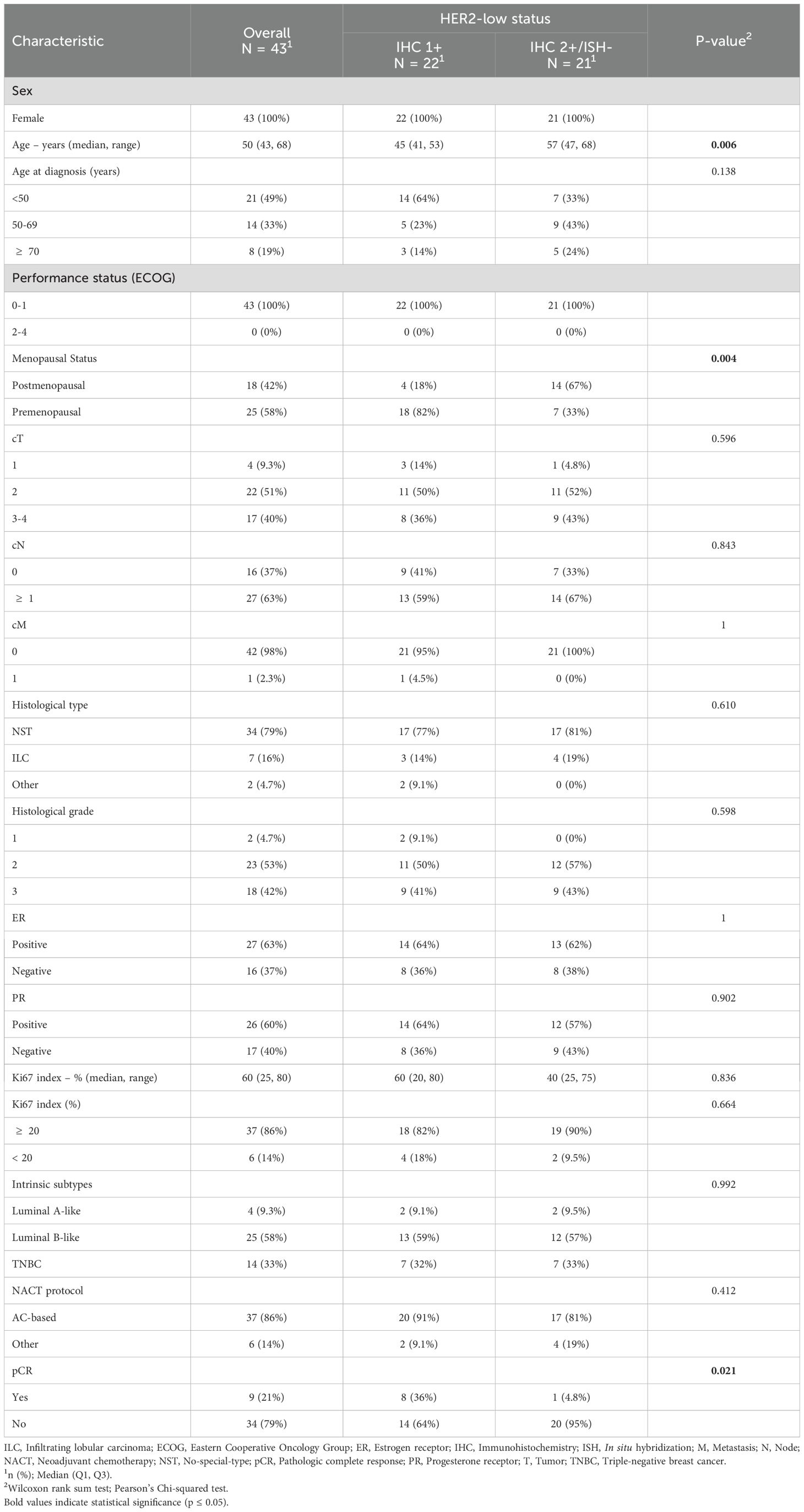 Results: A total of 222 patients were included, evenly divided between IHC1+ (n=105, 47%) and IHC2+/ISH- (n=117, 53%) tumors, with no significant differences in baseline characteristics. Both subgroups predominantly comprised female patients (99% IHC1+ vs. 98% IHC2+/ISH-), postmenopausal (55% vs. 58%), with early-stage BC (94% vs. 98%) and estrogen receptor (ER)-positive tumors (90% vs. 90%). Around two-thirds had grade 2 tumors (63% vs. 64%), and the median Ki-67 index was 20% in both subgroups. Most BC were classified as luminal B-like (56% vs. 58%), followed by luminal A-like (35% vs. 34%), and TNBC (9% vs. 8%). Among the 43 patients with HER2-low BC who received NACT, 36% of IHC1+ patients achieved pCR, compared to only 5% in the IHC2+/ISH- subgroup (p = 0.021). Multivariable analysis revealed that IHC2+/ISH- status (vs. IHC1+) was significantly associated with lower odds of pCR (OR=0.07, 95% CI: 0.00–0.51, p = 0.025), while higher baseline Ki-67 and ER-negative status showed non-significant trends toward higher pCR rates after adjustment for other variables.