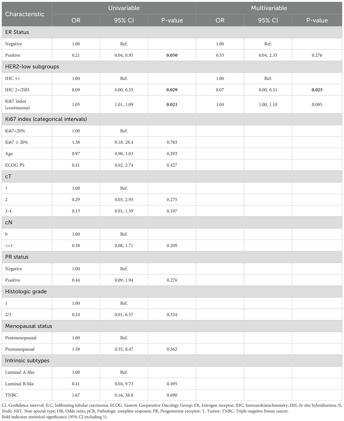 The relationship between clinicopathological variables and pCR was examined using a logistic regression model. In univariable analysis, IHC 2+/ISH− (vs IHC 1+) and ER−positive (vs ER−negative) status were associated with lower odds of pCR (OR 0.09, 95% CI 0.00–0.55, P=0.029; and OR 0.21, 95% CI 0.04–0.95, P=0.050, respectively), whereas higher baseline Ki−67 (as a continuous variable) was associated with higher odds of pCR (OR 1.05 per 1% increase, 95% CI 1.01–1.09, P=0.021). In the pre−specified multivariable model — limited to HER2−low subgroup, ER status, and baseline Ki−67 per the purposeful−selection plan — only the association for IHC 2+/ISH− remained statistically significant (OR 0.07, 95% CI 0.00–0.51, P=0.025), while ER status and Ki−67 showed non−significant trends after adjustment (Table 3).