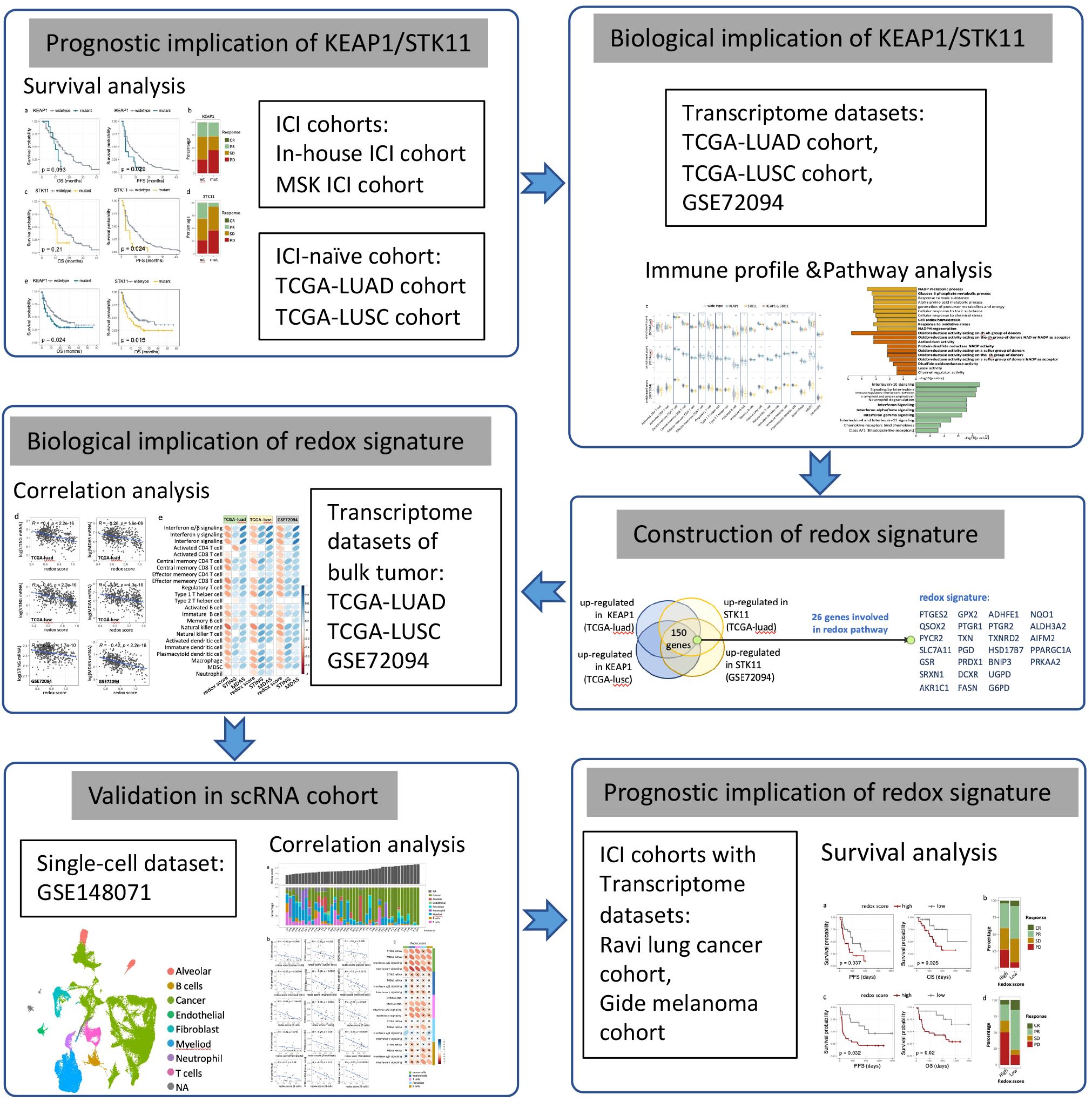 In summary, our study elucidated the mechanism by which redox phenotype mediated immune evasion in NSCLC harboring STK11 or KEAP1 mutation. We first established a connection between redox phenotype and repression of pathways involved in dsDNA/dsRNA sensing, and clarify their association in suppressing immune infiltration. We findings also suggested that redox status predominantly suppressed STING/MDA5 expression in tumor cells but not among other cell types within TIME. Our self-developed redox signature also may serve as a predictive biomarker for ICI responsiveness.