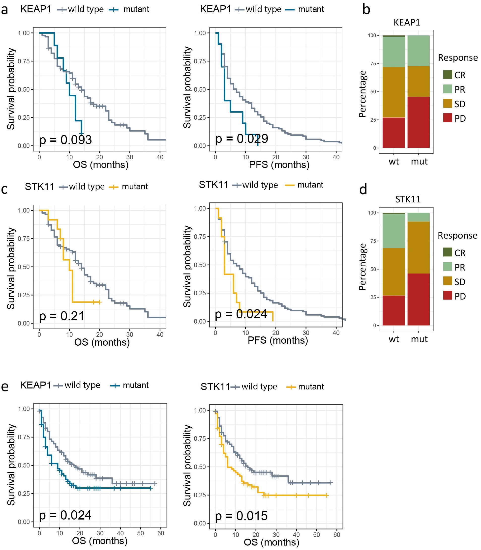 Figure 2. Association between mutation status of KEAP1/STK11 and therapeutic outcomes to immunotherapy. (a, c). Kaplan–Meier survival curves of progression-free survival (PFS) and overall survival (OS) between patients with wild-type and mutant KEAP1 (a), as well as between patients with wild-type and mutant STK11 (c) in our own immunotherapy cohort; (b, d) Bar charts showing the distribution of patients with complete response (CR), partial response (PR), stable disease (SD) or progression disease (PD) between patients with wild-type and mutant KEAP1 (a), as well as between patients with wild-type and mutant STK11 (c) in our own immunotherapy cohort; (e) Kaplan–Meier survival curves of OS by mutational status of KEAP1 or STK11 among NSCLC patients from MSK immunotherapy cohort.