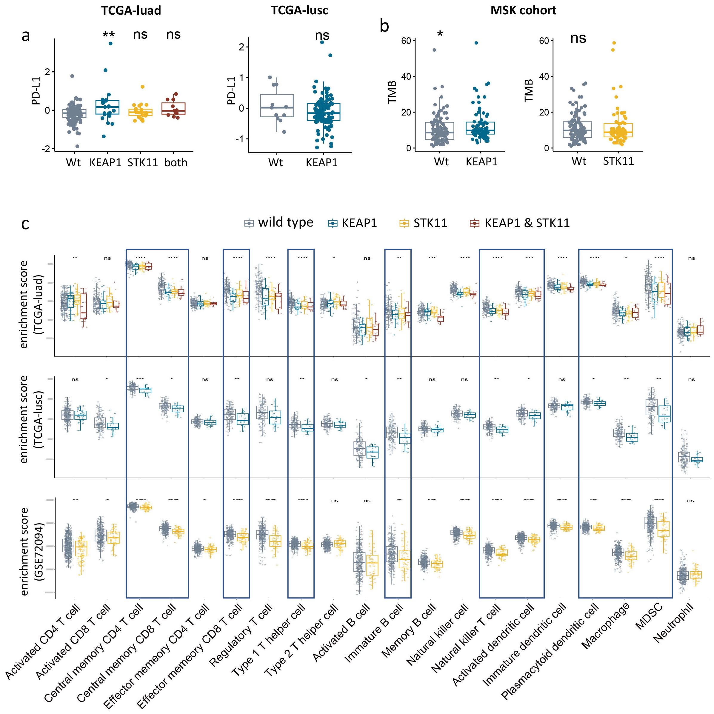 Figure 3. Immunologic consequences of KEAP1/STK11 mutations. (a) Boxplots showing PD-L1 protein expression level in NSCLC with mutant or wild-type KEAP1/STK11. Analysis was performed in two cohorts (TCGA-luad, TCGA-lusc). (b) Boxplots showing TMB level of KEAP1/STK11 mutant or wild-type tumors from MSK immunotherapy cohort. (c) Boxplots showing infiltrating abundance of 20 immune cells among tumors with mutant or wild-type KEAP1/STK11. Analysis was performed in three cohorts (TCGA-luad, TCGA-lusc, GSE72094). (a, c) As for TCGA-luad cohort, tumors were categorized into four groups based on mutational status of KEAP1 and STK11. Analysis only involved mutational status of KEAP1 or STK11 in TCGA-lusc cohort and GSE72094 cohort respectively, owing to insufficiency or unavailability of relevant data. (a–c) Data are presented as median with quartiles. Wilcoxon tests was used to determined significance in difference between two groups. Kruskal -Wallis was performed for multiple comparison. *P < 0.05, **P < 0.01, ***P < 0.001, ****P < 0.0001.