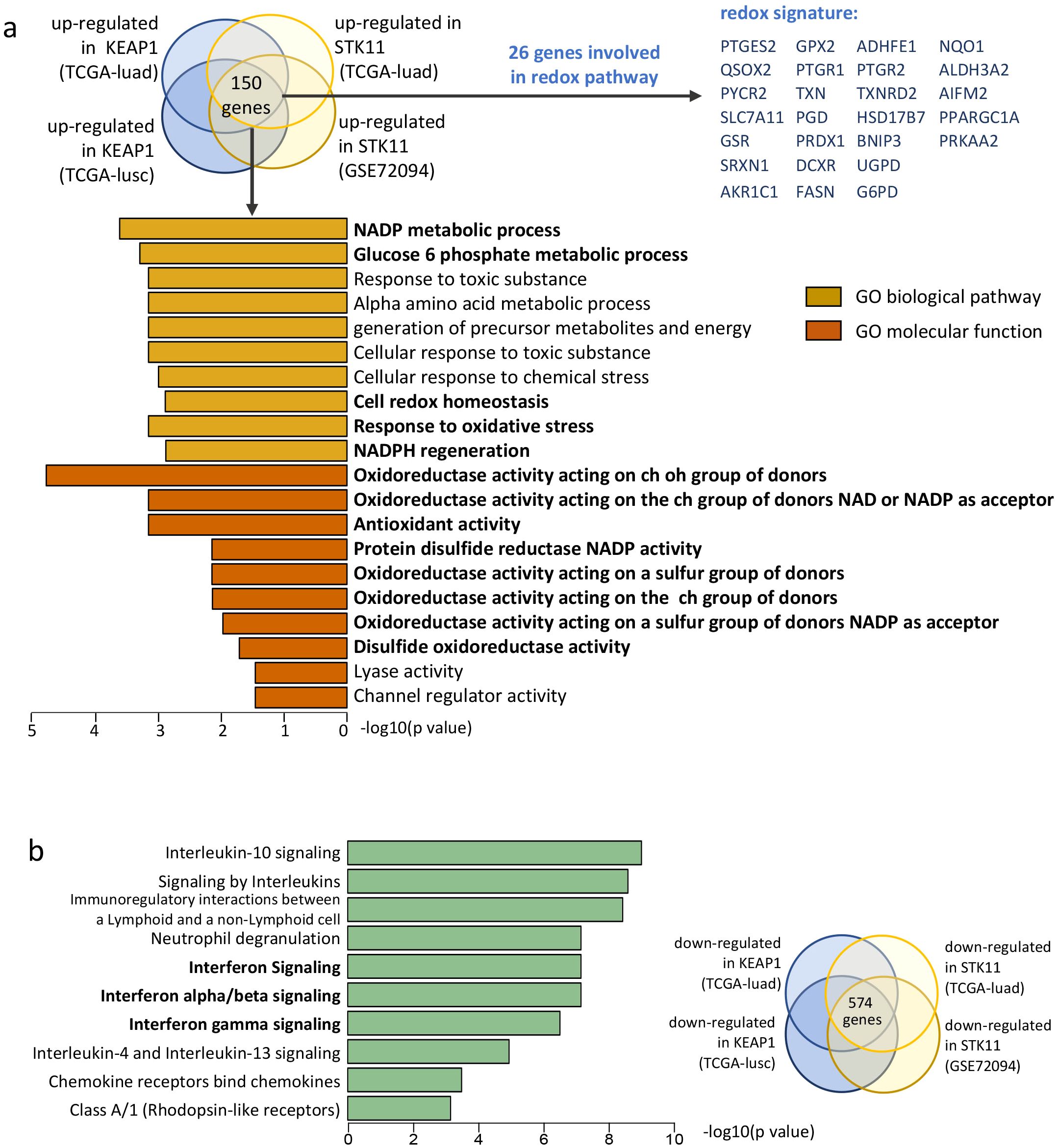 Figure 4. Pathway analysis reveals enrichment of redox pathways and down-regulation of IFN signaling in NSCLC with KEAP1/STK11 mutations. (a) Gene signature enrichment analysis (GSEA) was performed for the overlapped up-regulated genes based on Gene Ontology (GO) categories. Diagram on the top showing the generation of overlapped genes up-regulated by KEAP1 and STK11 among different cohorts. A total 150 overlapped genes identified, among which 26 genes were identified to be involved in redox biological process. Bar plot showing the top 10 most significantly enriched pathways for the GO-biological pathway category and GO-molecular function category respectively. (b) Gene signature enrichment analysis (GSEA) was performed for the overlapped down-regulated based on Reactome categories. Diagram on the right showing the generation of overlapped genes down-regulated by KEAP1 and STK11 among different cohorts, with a total 574 overlapped genes identified. Bar plot showing the top 10 most significantly enriched pathways.