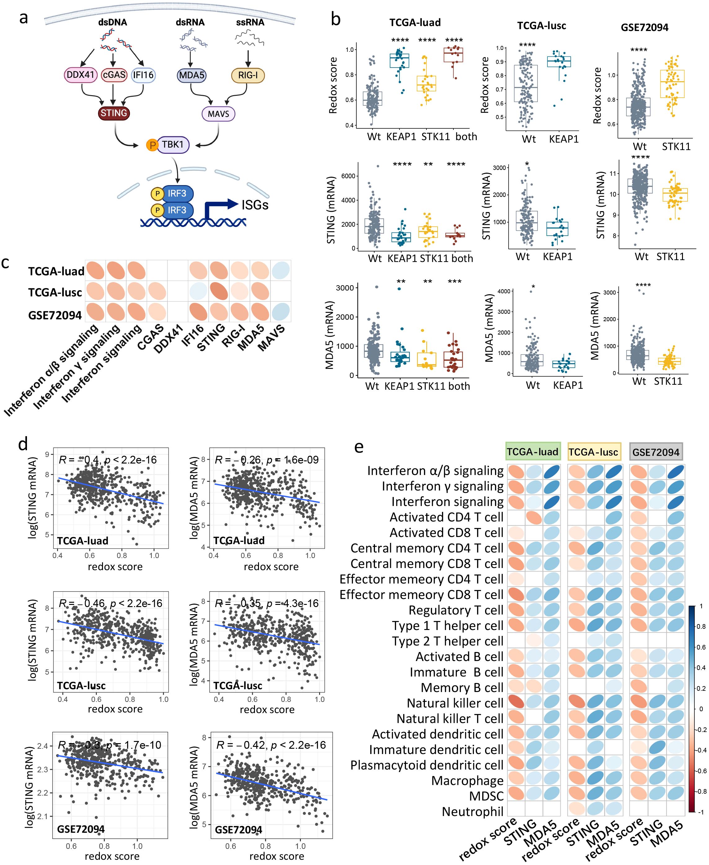 Figure 5. Redox scoring negatively correlated with STING/MDA5 expression, IFN signaling and immune infiltration in NSCLC. (a) Schematic of dsDNA, dsRNA, ssRNA sensing pathways that induce IFN signaling. (b) Boxplots showing STING/MDA5 mRNA expression and redox score among tumors with mutant or wild-type KEAP1/STK11 in three cohorts (TCGA-luad, TCGA-lusc, GSE72094). As for TCGA-luad cohort, tumors were categorized into four groups based on mutational status of KEAP1 and STK11. Analysis only involved mutational status of KEAP1 or STK11 in TCGA-lusc cohort and GSE72094 cohort respectively, owing to insufficiency or unavailability of relevant data. Data are presented as median with quartiles, and Wilcoxon tests was used to determined significance in difference between wild-type group and other groups. *P < 0.05, **P < 0.01, ***P < 0.001, ****P < 0.0001. (c) Correlation matrix depicting correlation of redox score with IFN signaling and genes involved in dsDNA/dsRNA/ssRNA sensing in three datasets (TCGA-luad, TCGA-lusc and GSE72094). (d) Scatter plot showing the correlation between redox score and mRNA expression of STING/MDA5 in three datasets (TCGA-luad, TCGA-lusc and GSE72094). Correlation coefficients (r value) and P value of Spearman Correlation were shown. (e) Correlation matrix depicting correlation of redox score and mRNA expression of STING with infiltrating level of 20 immune cells in three datasets (TCGA-luad, TCGA-lusc and GSE72094). (c, e) Spearman Correlation analysis was performed, with blue ellipse obliquely upward representing positive correlation, and red ellipse obliquely downward representing negative correlation. The flatness of ellipse and the depth of the color represent the magnitude of the correlation (r value). Ellipse was presented only for those with significant correlation (P value < 0.05).
