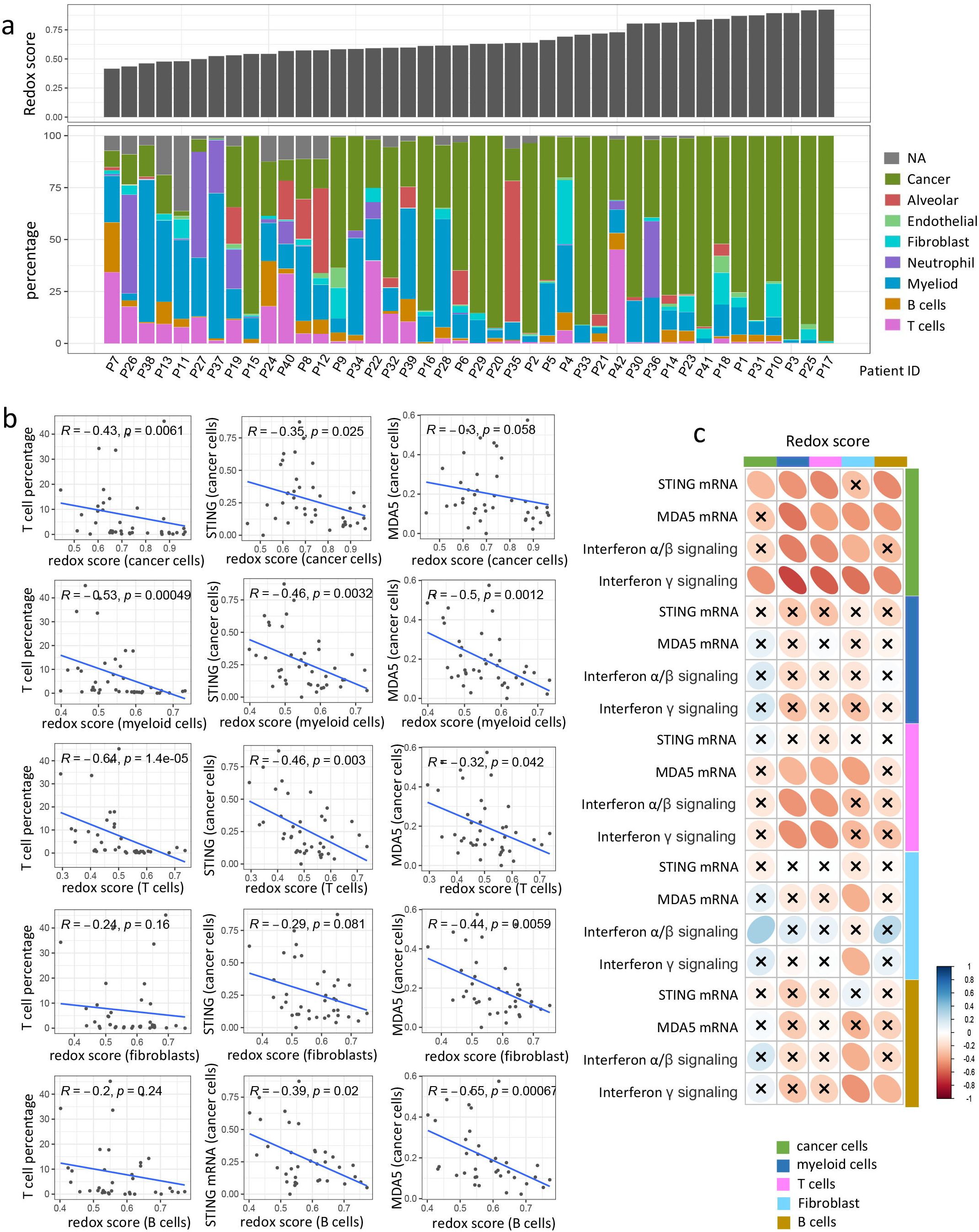 Figure 6. scRNA analysis reveals redox phenotype down-regulates STING/MDA5 expression in cancer cells and facilitates immune exclusion. (a) Barplots showing bulk redox score and proportion of different cellular components in each tumor. Tumors were arranged according to bulk redox score in ascending order. (b) Scatter plot showing the correlation of T cell percentage or STING/MDA5 mRNA expression in cancer cells with redox score of different cellular components. Correlation coefficients (r value) and P value of Spearman Correlation were shown. (c) Correlation matrix showing correlation of redox score with STING/MDA5 mRNA expression or IFN signaling (Interferon α/β signaling and Interferon γ signaling) across different cell types. Spearman Correlation analysis was performed, with blue ellipse obliquely upward representing positive correlation, and red ellipse obliquely downward representing negative correlation. The flatness of ellipse and the depth of the color represent the magnitude of the correlation (r value). The cross mark represents the failure of the significance test (P value > 0.05).