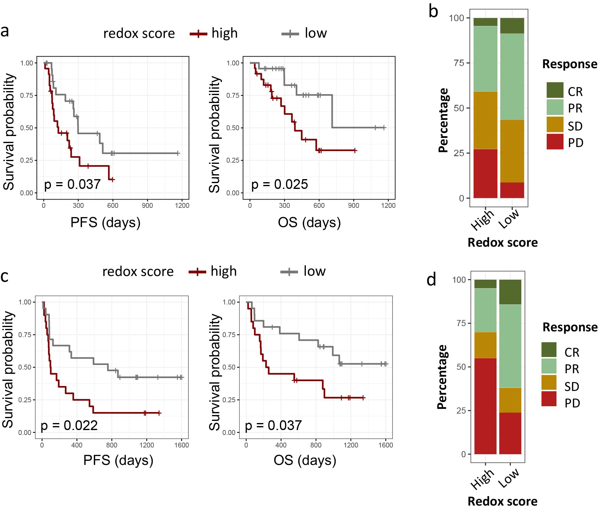 Panel a displays Kaplan-Meier survival curves for progression-free survival (PFS) and overall survival (OS) based on high and low redox scores, indicating lower survival probabilities in the high redox group with p-values of 0.037 and 0.025 respectively. Panel b is a bar chart showing response percentages (CR, PR, SD, PD) by redox score, with more PD in the high redox group. Panel c shows similar survival analyses with p-values 0.022 and 0.037. Panel d mirrors panel b with response distributions by redox score.