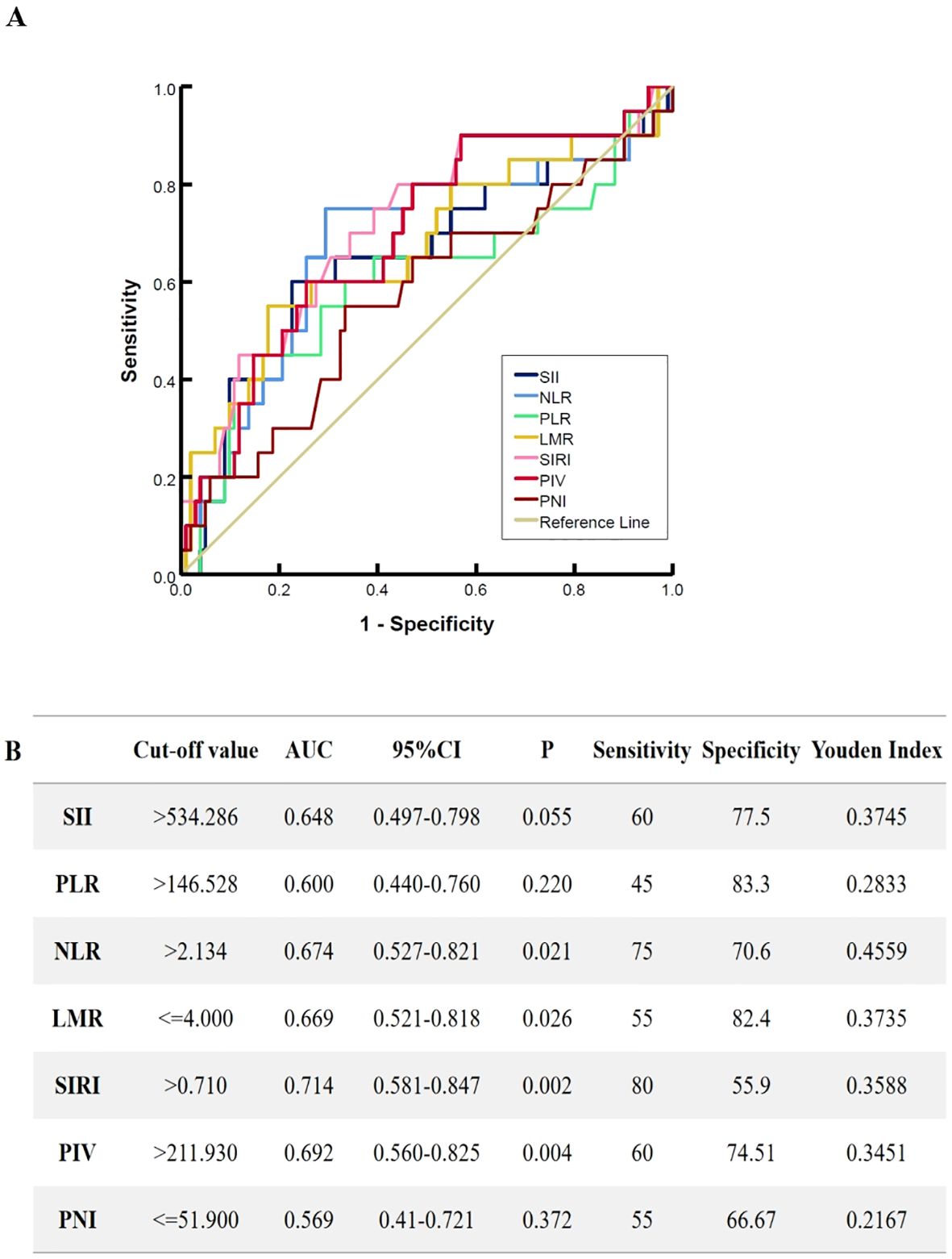 Figure 1. The receiver operating characteristic curves for pretreatment inflammation markers. (A) the ROC characteristic of SII, NLR, LMR, PLR, SIRI, PIV and PNI, (B) The selection of the optimal cutoff values and predictive power of inflammation markers on patient. SII, systemic immune/inflammatory response index calculated by multiplying platelets by neutrophils and divided by lymphocytes; NLR, neutrophil/lymphocyte ratio; LMR, lymphocyte/monocyte ratio; PLR, platelet/lymphocyte ratio; SIRI, systemic inflammation response index; PIV, pan-immune-inflammation value; PNI, prognosis nutritional index.