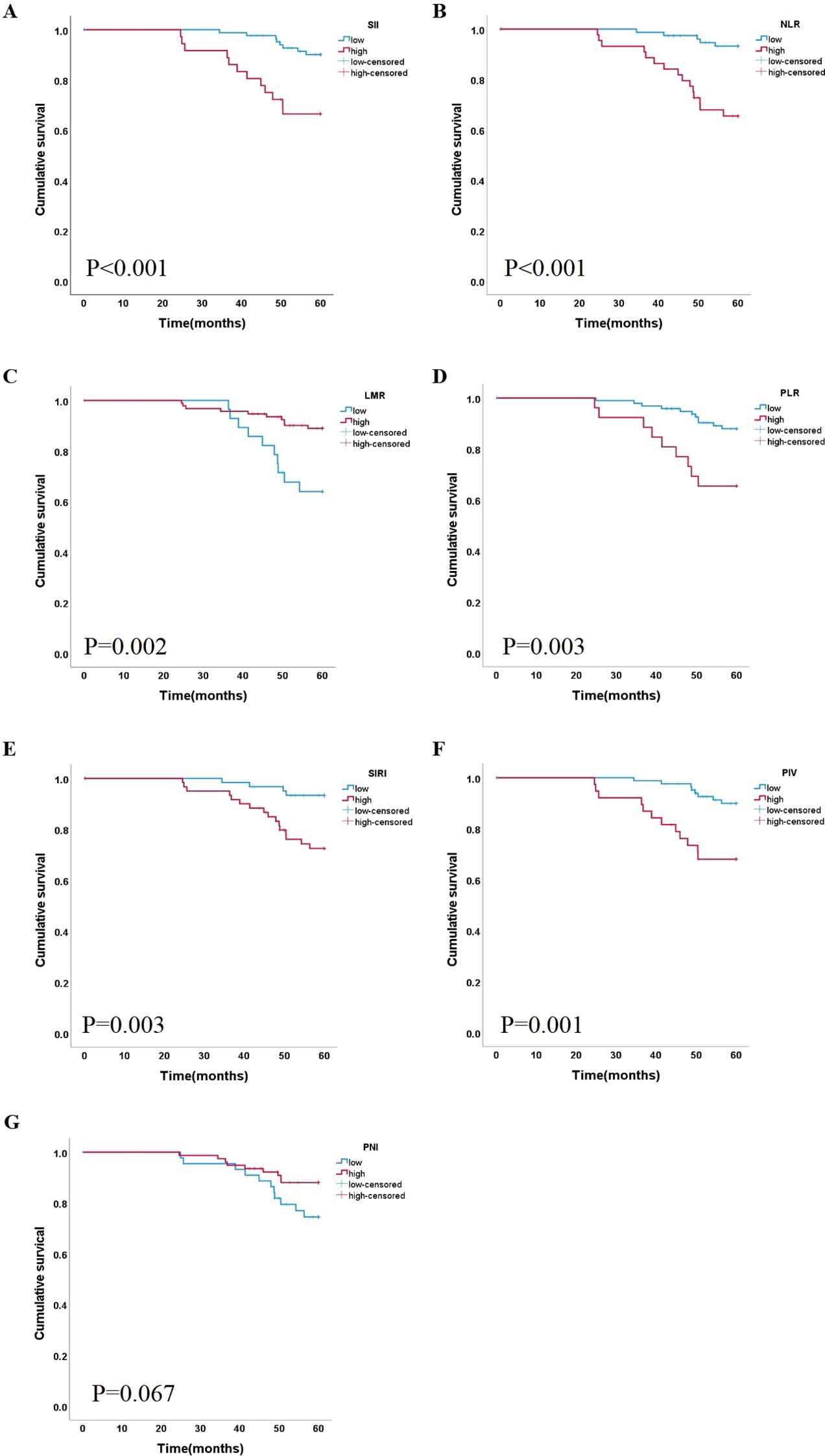 Figure 2. Correlation between the level of 7 indicators and lip cancer survival. Kaplan-Meier curves based on inflammation markers (A) SII, (B) NLR (C) LMR, (D) PLR, (E) SIRI, (F) PIV and (G) PNI SII, systemic immune/inflammatory response index calculated by multiplying platelets by neutrophils and divided by lymphocytes; NLR, neutrophil/lymphocyte ratio; LMR, lymphocyte/monocyte ratio; PLR, platelet/lymphocyte ratio; SIRI, systemic inflammation response index; PIV, pan-immune-inflammation value; PNI, prognosis nutritional index.