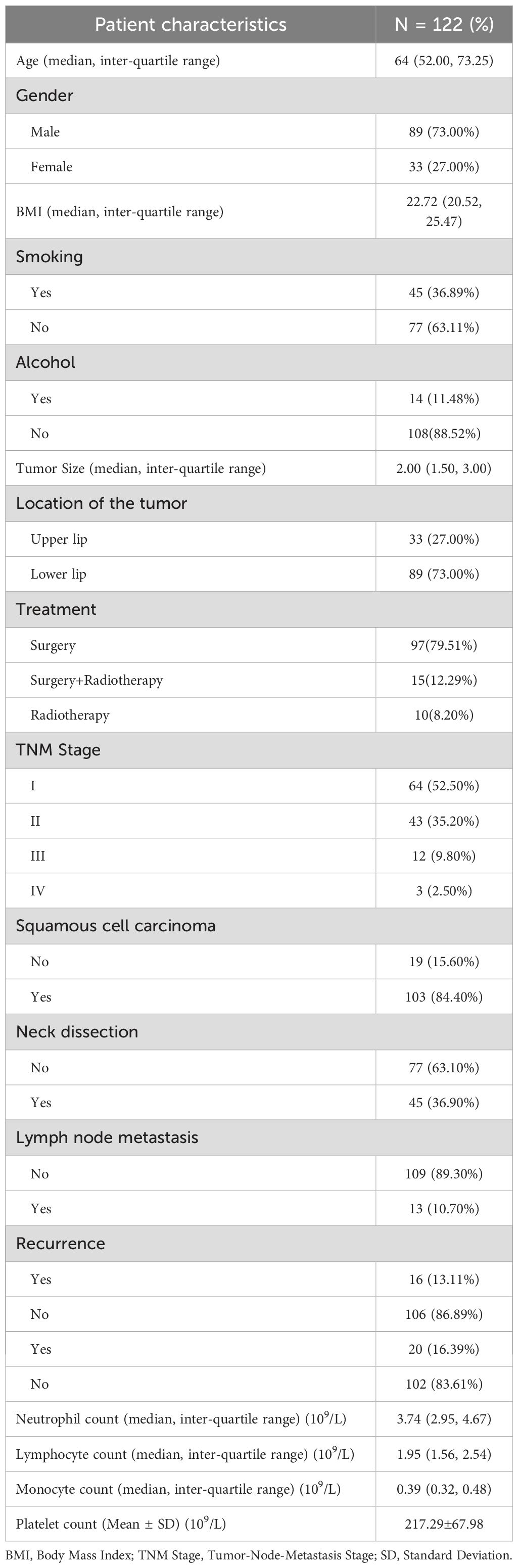 Detailed characteristics of the 122 patients are shown in Table 1. In short, the patients included 89 (73.00%) males and 33 (27.00%) females aged 17–90 years. The mean age at diagnosis was 64 (52.00, 73.25) years. 36.89% (45/122) of participants reported having a smoking history, while 11.48% (14/122) indicated a history of alcohol consumption. In the current study, most lesions were located in the lower lip (73.00%), while 33 (27.00%) were located in the upper lip, with a mean tumor size of 2.36 ± 1.14cm. In this study, the treatment modalities for lip cancer consisted of surgery alone (97 patients, 79.51%), surgery combined with radiotherapy (15 patients, 12.29%), and radiotherapy alone (10 patients, 8.20%). No patients underwent chemotherapy as part of their treatment regimen. Most of patients (84.40%) were diagnosed with squamous cell carcinoma, 15.60% of patients were other clinicopathologic results. 64 (52.50%) patients were at TNM stage I, 43 (35.20%) were at stage II. Neck dissection was performed in 45 patients (36.90%), among whom 13 (10.70% of total patients) had lymph node metastasis. The complete blood count analysis revealed the following median values with interquartile ranges: neutrophils 3.74 (2.95-4.67) × 109/L, monocytes 1.95 (1.56-2.54) × 109/L, and lymphocytes 0.39 (0.32-0.48) × 109/L Platelets averaged 217.29 ± 67.98 × 109/L.