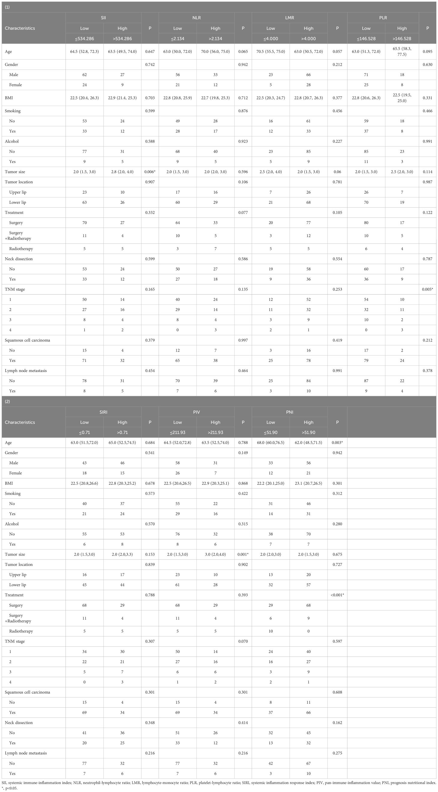 Peripheral blood inflammatory biomarkers have demonstrated the prognostic significance in different diseases. Elevated inflammatory responses in the tumor microenvironment consistently correlating with poorer clinical outcomes (19). These biomarkers not only show significant associations with patient prognosis but also serve as independent prognostic factors in multiple cancer type (20), including lung cancer, renal cell carcinoma (21), and liver cancer (22). Inflammation indices have been established as predictors of carcinogenesis and disease progression in head and neck malignancies. However, most prior studies focused on the larynx, tongue, and oral cavity, our study presents an extensive analysis of systemic indices and their link to unfavourable prognosis in lip cancer, a topic not previously reported. The findings reveal correlations between peripheral blood inflammatory markers and both poor survival outcomes and disease recurrence in lip cancer patients. Furthermore, we systematically evaluate composite biomarkers including SIRI, PIV and PNI to elucidate the synergistic impacts of immune dysregulation, systemic inflammation, and nutritional status on disease progression. This multidimensional analysis provides novel insights into the correlation between host inflammatory responses and lip cancer outcomes.