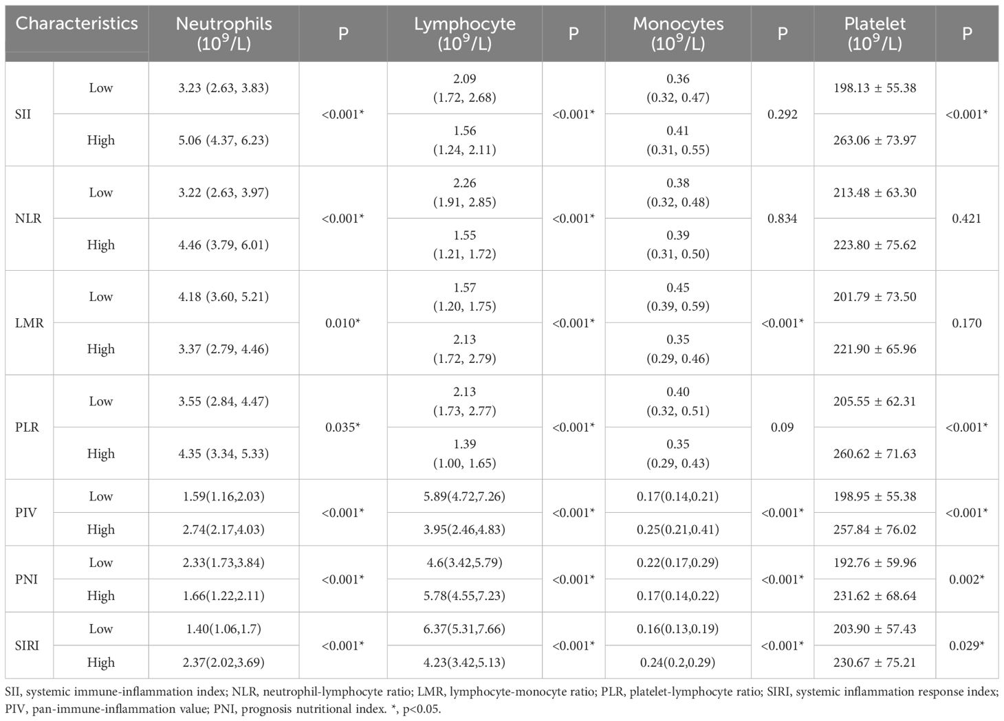 All blood specimens were acquired from patients within 7 days of treatment. Peripheral blood cell counts were determined and classified, including neutrophils, monocytes, lymphocytes, and platelets. Inflammatory indices were calculated based on previously established methods (16–18): SII = platelets × neutrophils/lymphocytes, NLR = neutrophil count/lymphocyte count, PLR =platelet count/lymphocyte count, LMR = lymphocyte count/monocyte count, SIRI = (neutrophil count × monocyte count)/lymphocyte count, PIV = (platelet count × neutrophil count × monocytes count)/lymphocyte count, serum albumin + 5 × lymphocyte count was used to determine the PNI.