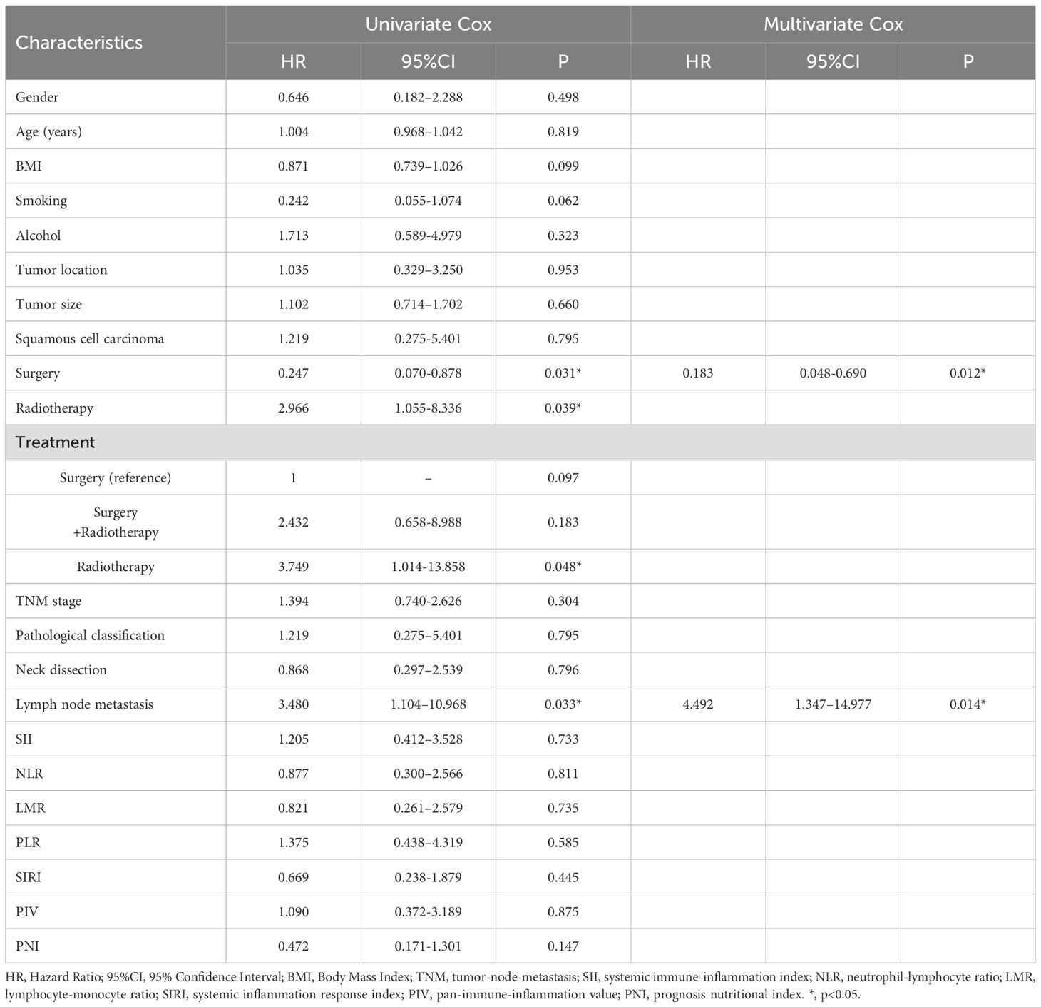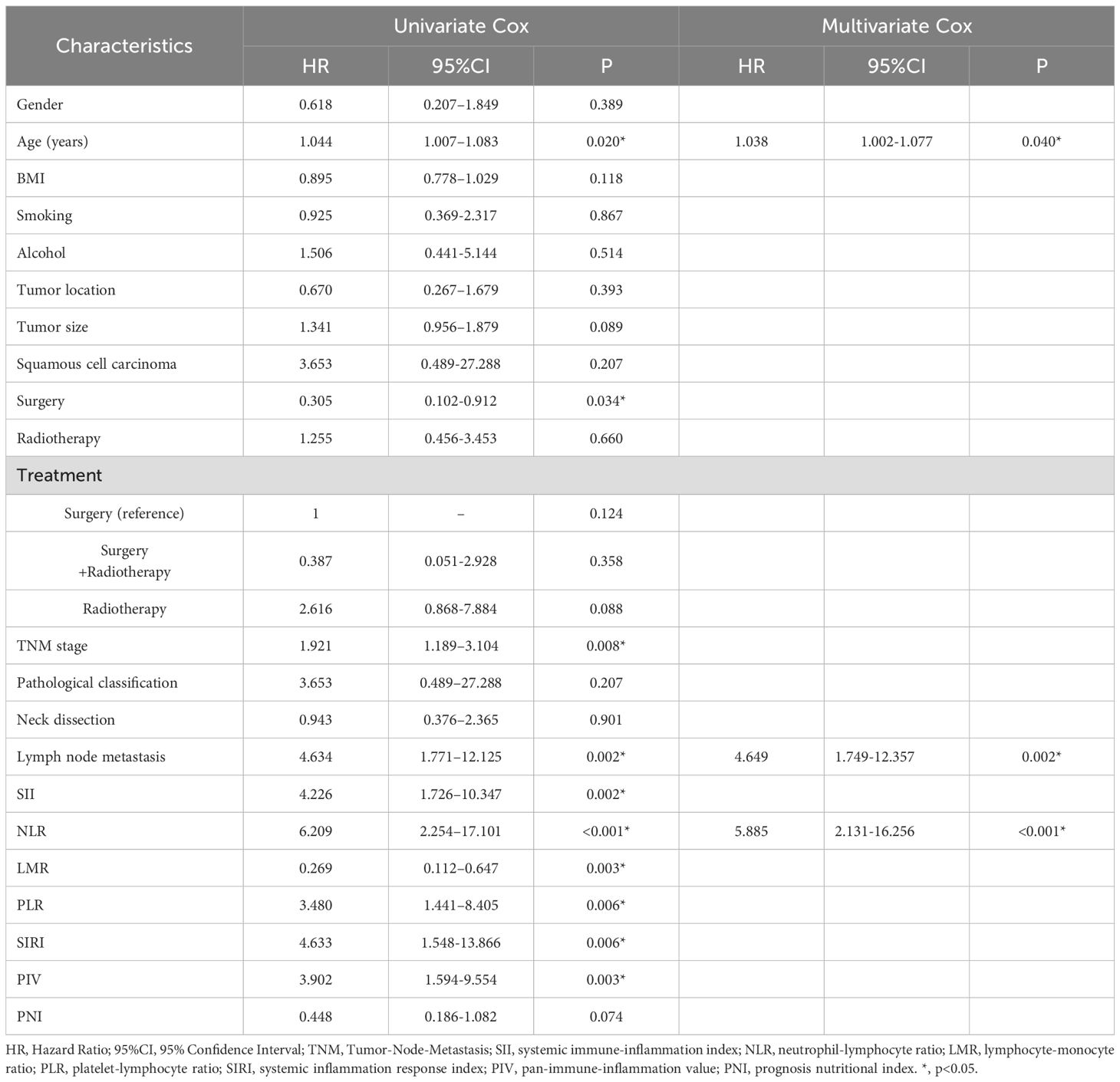 The indices SII, NLR, PLR, LMR, SIRI, PIV and PNI were associated with poor overall survival in the univariate analysis. Kaplan-Meier curves in our study demonstrated that SII, NLR, PLR, SIRI, and PIV were positively correlated with poor prognosis in lip cancer, while LMR showed a negative correlation. Blood inflammatory biomarkers have better prognostic value than nutrition-related index. These biomarkers are closely linked to the inflammatory-immune imbalance within TME. Low LMR or elevated NLR reflects lymphocytopenia, indicating impaired immune surveillance that leads to insufficient CD8+ T cell responses against tumor-specific antigens. Additionally, a high MLR may be associated with monocyte differentiation into M2-polarized macrophages, which suppress local immune activity through TGF-β secretion and promote the maintenance of cancer stem cell-like phenotypes. Lip cancer likely sustains a low-grade inflammatory state in the TME, resulting in persistently elevated PBIBs. This chronic inflammation further activates pro-survival genes via the NF-κB signaling pathway, exacerbating therapeutic resistance (23). Collectively, these mechanisms elucidate the independent prognostic value of PBIBs for survival outcomes in lip cancer and provide a theoretical foundation for future precision therapies targeting inflammatory pathways.