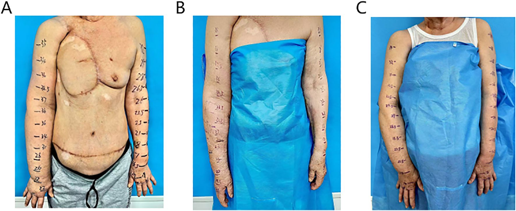 Significant reduction in swelling of the right upper arm was observed 10 days postoperatively. Circumferential measurements were taken at 5 cm intervals, starting from the first web space of the right hand and the wrist crease, extending proximally to the shoulder. A marked decrease in circumference was noted at each measurement site (Figure 1B). 5 months post-surgery, repeat measurements demonstrated further improvement in limb circumference compared to the 10-day postoperative assessment (Figure 1C). Detailed numerical data are presented in the Table 1.