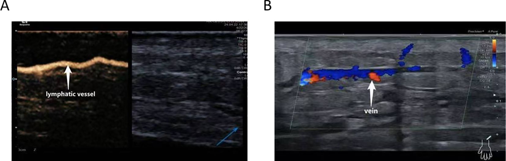 Figure 2. CEUS–assisted localization of functional lymphatic vessels (A) and target veins adjacent to lymphatic vessels (B).