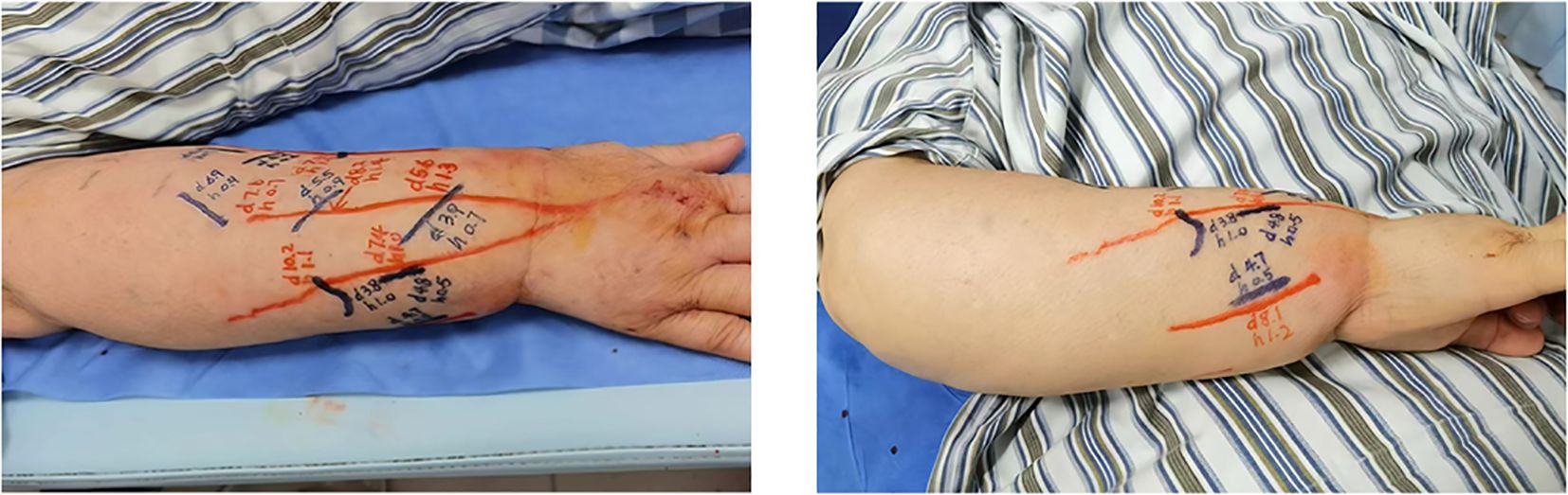 CEUS was employed to precisely localize functional lymphatic vessels and target recipient veins (Figure 2) one day prior to surgery, followed by precise skin marking for intraoperative localization (Figure 3). On April 23, 2024, the patient underwent right upper limb lymphaticovenous anastomosis under general anesthesia. The surgical procedure entailed the following steps: (1) the patient was placed in the supine position with the affected limb abducted at 90°, followed by endotracheal intubation and standard sterile preparation; (2) an incision was made at the site of preoperatively identified lymphatic vessels and recipient veins near lymph node basins, with careful dissection to isolate the vessels; (3) end-to-end anastomosis of lymphatic vessels to veins was performed using 11–0 nylon sutures under microscopic magnification (Figure 4);(4) meticulous hemostasis was ensured, and the subcutaneous tissue and skin were closed in layers with running sutures; (5) postoperative management included compression bandaging with elastic wraps, skin care, and rehabilitation exercises as part of comprehensive decongestive therapy.
