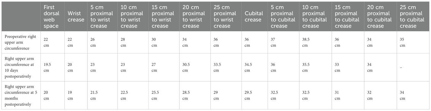 Table 1. Preoperative and postoperative circumference measurements at different sites of the patient’s right upper arm.