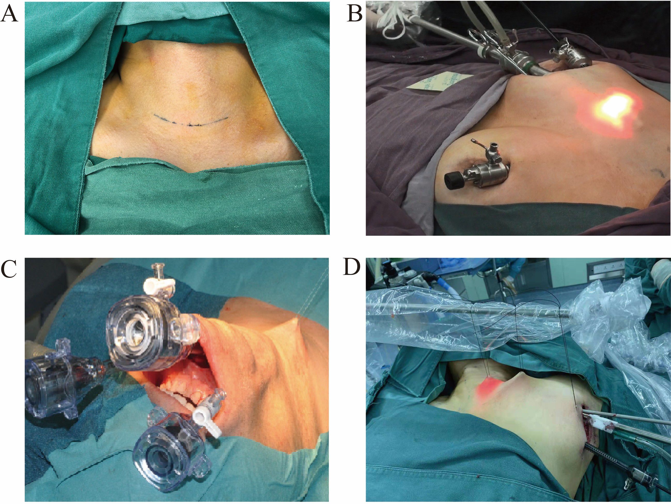 Figure 2. Four intraoperative photos of the surgeries (A) Conventional open thyroidectomy. (B) Transoral endoscopic thyroidectomy vestibular approach. (C) Transoral endoscopic thyroidectomy. (D) Axillary approach endoscopic thyroidectomy.