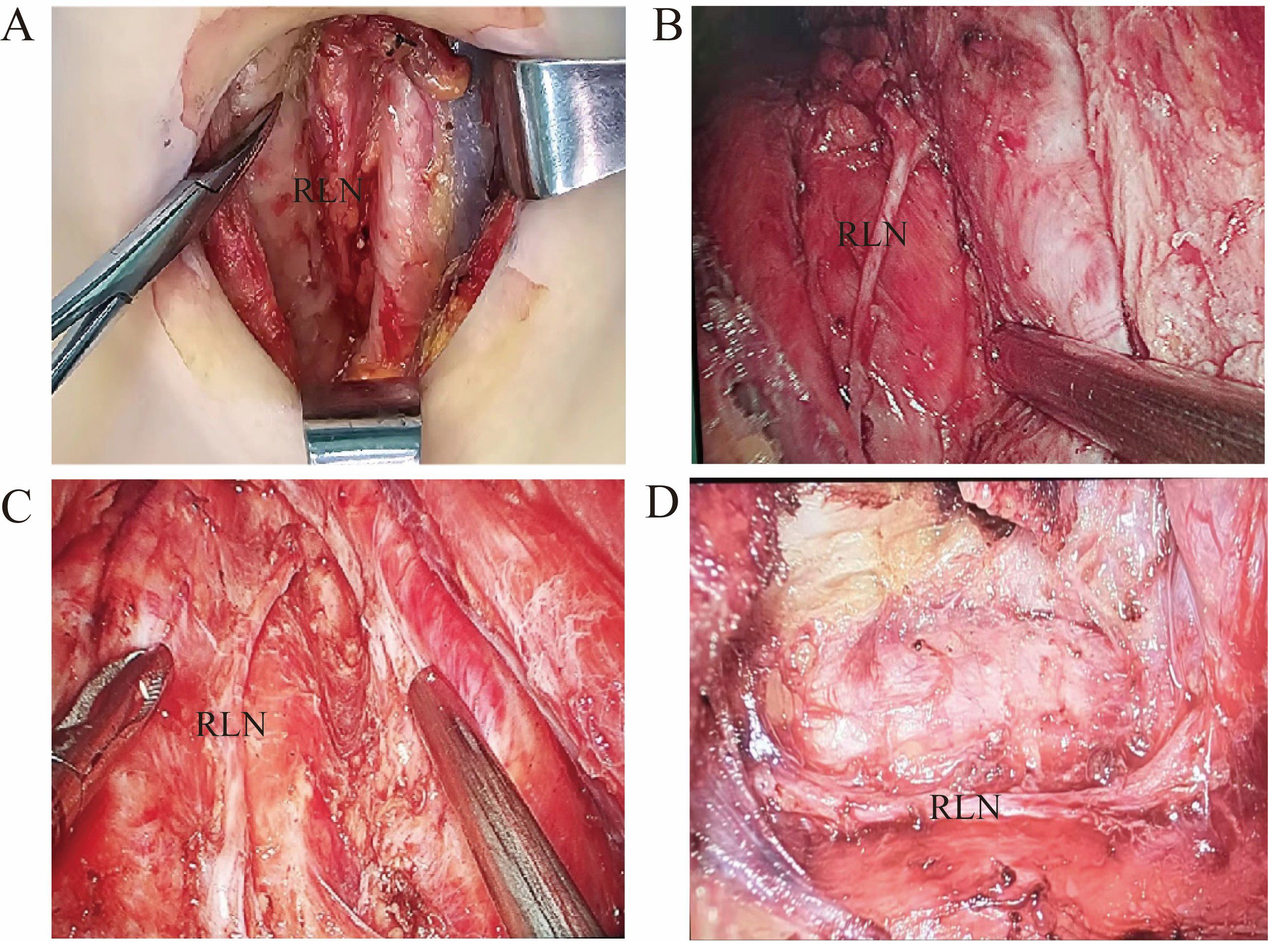 Surgical images showing the exposure of the recurrent laryngeal nerve (RLN) in four panels labeled A, B, C, and D. Each panel highlights the RLN in a different view during a procedure, with surgical tools and tissue variation visible.