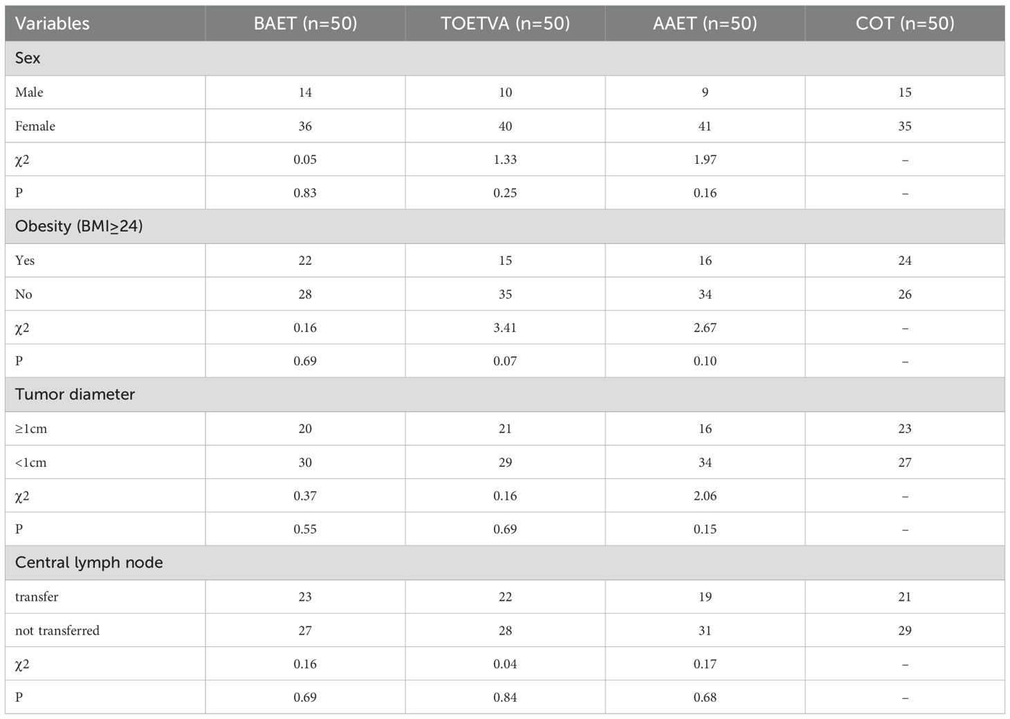 A total of 200 patients with unilateral differentiated thyroid cancer who were treated at our hospital between January 2022 and December 2024 were enrolled and divided into 4 groups based on the surgical approach: (1) conventional open thyroidectomy (COT); (2) bilateral areolarapproach endoscopic thyroidectomy (BAET); (3) transoral endoscopic thyroidectomy vestibular approach (TOETVA); (4) axillary approach endoscopic thyroidectomy (AAET). Patients were further grouped by gender, body mass index (BMI), and case frequency as follows: (1) BAET group (n = 50) and COT group (n = 50), (2) TOETVA group (n = 50) and COT group (n = 50), and (3) AAET group (n = 50) and COT group (n = 50).The surgeries described above were performed by surgeons from different operative teams, with each surgeon having accumulated over 300 cases of experience in the specific surgical procedure they conducted.