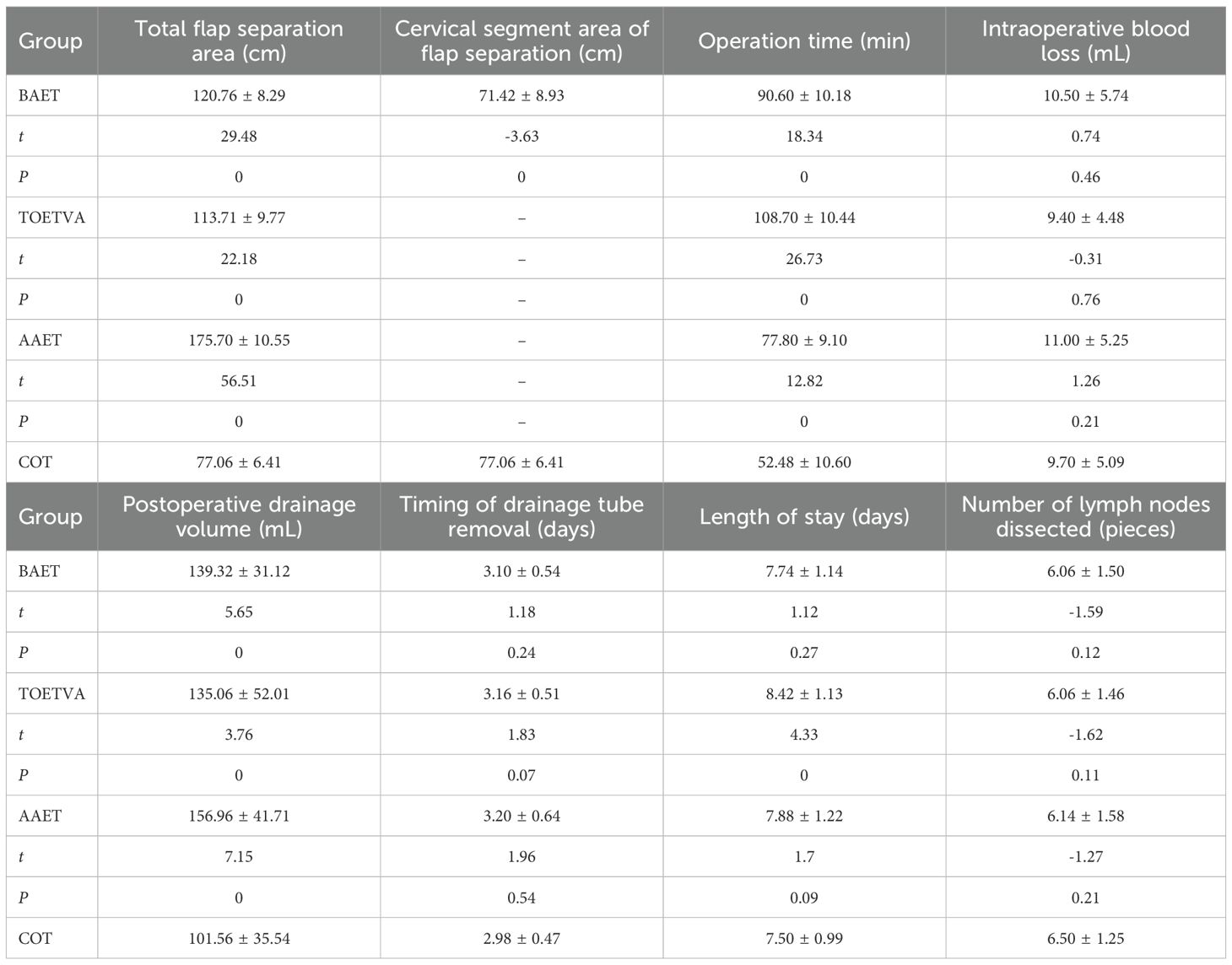 The endoscopic surgery group exhibited a significantly greater total flap separation area, longer operation duration, and higher postoperative drainage volume compared with the open surgery group (P < 0.05).the cervical flap separation area in the BAET group was significantly smaller than that in the open surgery group (P < 0.05). The TOETVA group exhibited a significantly extended hospital stay compared with the open surgery group (P < 0.05).The differences in intraoperative blood loss, timing of drainage tube removal and number of lymph node dissections between the endoscopic surgery group and the traditional open thyroidectomy group were statistically non-significant (P > 0.05).The differences in hospital stay between the BAET group, the AAET group and the traditional open thyroidectomy group were statistically non-significant (P > 0.05)(Table 3).