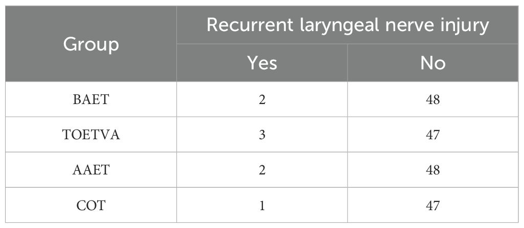 No cases of postoperative subcutaneous hematoma or infection were observed in any of the groups, including the BAET, TOETVA, AAET, and COT groups, indicating no significant differences in these complications among the groups. Because unilateral thyroid surgery rarely results in parathyroid gland damage, only recurrent laryngeal nerve injury was compared. No permanent recurrent laryngeal nerve injury occurred in any group. One case of transient recurrent laryngeal nerve injury was reported in the COT group, with vocal function returning to normal approximately 50 days postoperatively. In the BAET group, two cases of transient recurrent laryngeal nerve injury were recorded, with recovery of normal vocal function around 50 days postoperatively. In the TOETVA group, three cases of transient recurrent laryngeal nerve injury were recorded; vocal recovery occurred in one case after 40 days and in two cases after approximately 45 days. In the AAET group, two cases of transient recurrent laryngeal nerve injury were recorded, with recovery of normal vocal function around 45 days postoperatively. No permanent recurrent laryngeal nerve injury occurred in any group, and no significant differences were observed between the groups (Table 5).