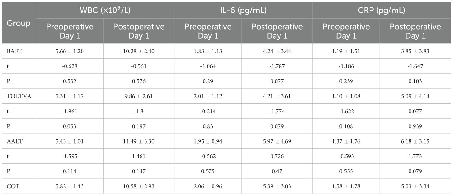 The serum levels of IL-6, CRP, and WBC were compared between groups using the t-test. No significant differences were observed in the preoperative levels (P > 0.05). Similarly, no significant differences were observed in the postoperative levels on the first day after surgery (P > 0.05) (Table 6).