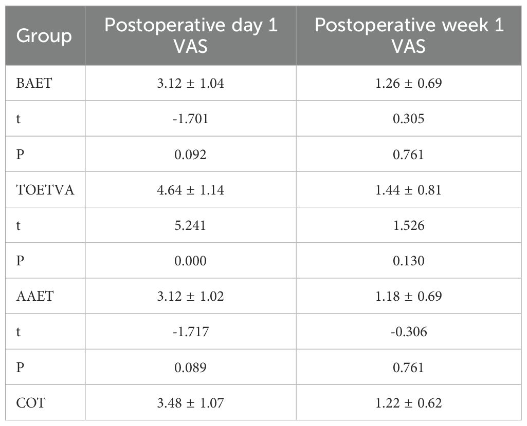 Follow-up was conducted via telephone, work WeChat, and outpatient visits, and all patients were followed up. On day 1 after surgery, the VAS pain score in the TOETVA group was significantly higher than that in the open surgery group (P < 0.05). No significant differences in VAS pain scores were observed among the BAET, AAET, and open surgery groups (P > 0.05). At 1 week after surgery, no significant differences in VAS pain scores were observed among the groups (P > 0.05) (Table 7).