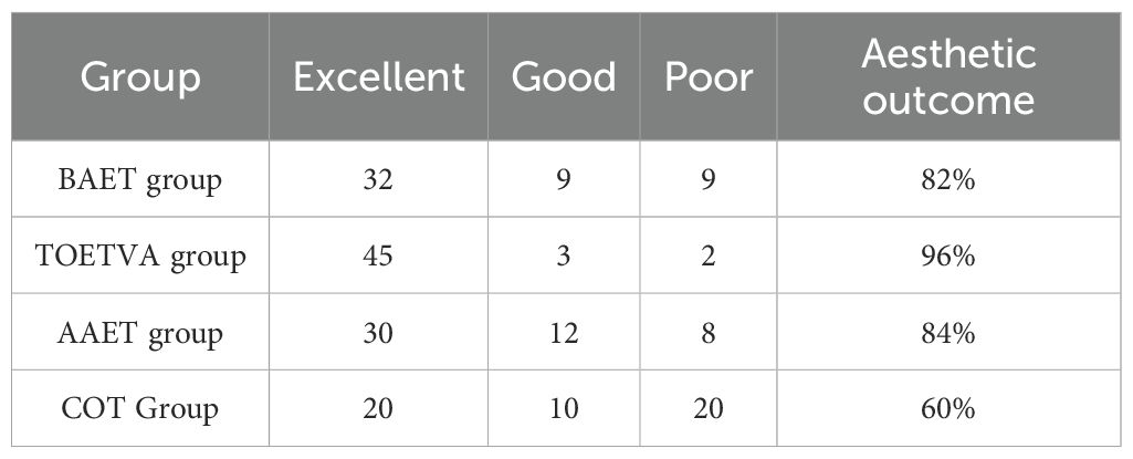 Follow-up was conducted via telephone, work WeChat, and outpatient visits, and all patients were followed up. The aesthetic satisfaction rates were 96% in the TOETVA group, 84% in the AAET group, 82% in the BAET group, and 60% in the COT group (Table 8).