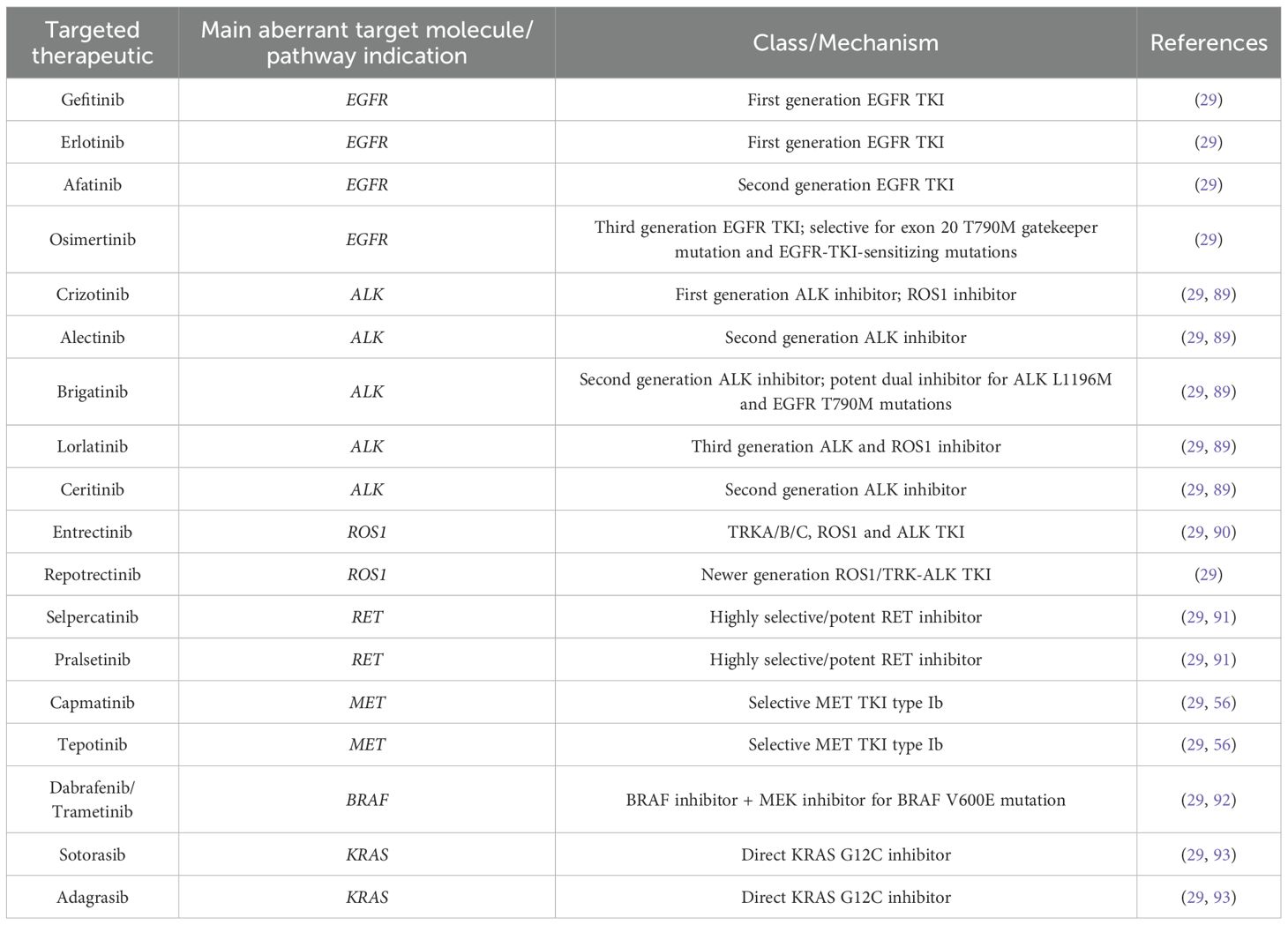 Lung cancer is an intricate malignancy, with an estimated 2.48 million new cases and 1.81 million deaths worldwide in 2022 alone (1). Many factors, including late diagnosis, patient characteristics and acquisition of cancer progression features can explain the poor prognosis (2). Comprehensive genomic characterization is increasingly recognized as essential in lung cancer management, as certain oncogene-driven lung cancers can benefit from targeted therapeutics. In specific cases, these targeted therapeutics can significantly prolong overall survival and/or progression-free survival compared to conventional chemotherapy and/or radiotherapy. For instance, in the PROFILE 1014 clinical trial, crizotinib, a first generation ALK tyrosine kinase inhibitor (TKI) significantly improved progression-free survival (PFS) in comparison to standard chemotherapy - median PFS (mPFS) = 10.9 months in the crizotinib group versus 7.0 months in the standard chemotherapy group; hazard ratio (HR) = 0.45, [95% CI 0.35-0.60], p < 0.001 for progression/death (3). Similarly, in patients with activating BRAF mutations, the combination of dabrafenib-trametinib in treatment-naive patients led to mPFS = 10.8 months [95% CI:7.0-14.5 months] and investigator-assessed median duration of response (mDoR) = 10.2 months [95% CI: 8.3-15.2 months] (4).