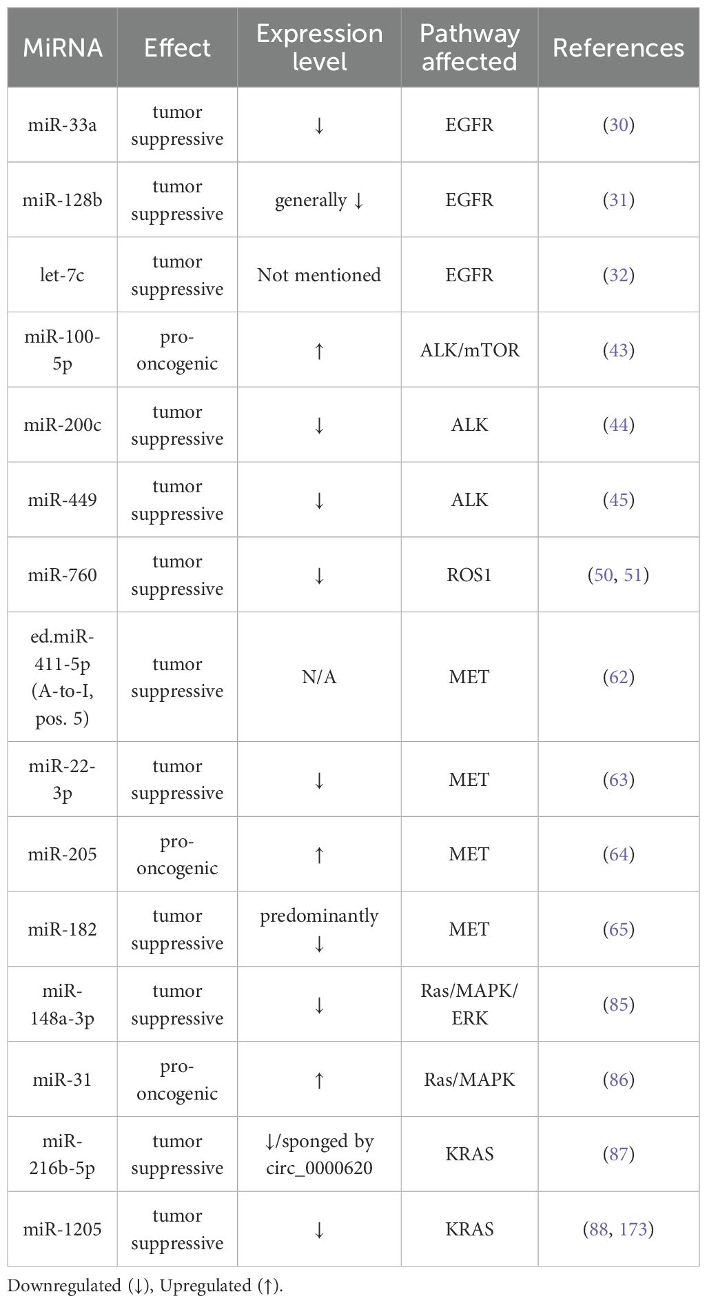 Several mutated/genetically altered genes drive lung cancer to a more aggressive phenotype. For instance, EGFR L858R point mutation in exon 21 and the LREA in-frame deletion on exon 19 are two EGFR activating mutations, which are druggable via EGFR TKIs. ALK rearrangements lead to constitutive ALK kinase activity, with lung tumors exhibiting increased aggressive behavior. This includes nodal metastasis and advanced stages at diagnosis; these ALK rearrangements are also druggable via targeted therapeutics such as crizotinib. Furthermore, lung cancer tumors harboring KRAS mutations carry usually a poor prognosis; KRAS activation induces interactions with several key pathways, such as the RAF/MEK/ERK pathway and the PI3K/AKT pathway. Targeted therapeutics are also available for patients harboring KRAS mutation - sotorasib, or adagrasib for KRAS G12C mutation. Other well-known genetic alterations that may be encountered in lung cancers include ROS1 rearrangements, RET translocations, alterations in the MET gene, NTRK fusions and BRAF mutations. Herein, we also provide a selection of miRNAs that target these essential driver genes/signaling pathways in lung cancer - for instance, miR-33a and miR-128b that target the EGFR pathway, miR-200c and miR-449 that target the ALK signaling, miR-205 that interferes with MET, miR-148a-3p that is tumor suppressive on the RAS/MAPK/ERK signaling and miR-31 that has pro-oncogenic effect by modulating the RAS/MAPK pathway.